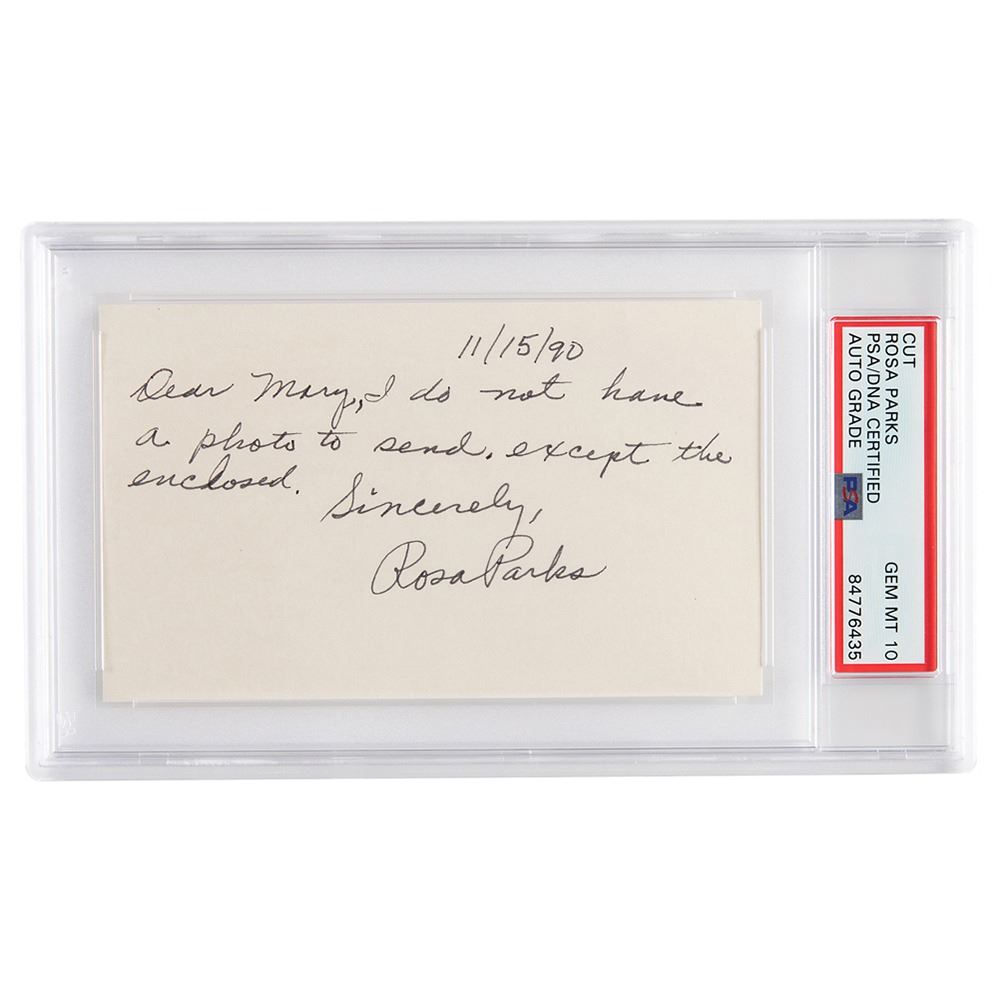 ALS signed & ldquo;Rosa Parks,& rdquo; one page, 5 x 3, November 15, 1990. Handwritten note, in full: "I do not have a photo to send, except the enclosed." In very fine condition. Encapsulated and graded by PSA/DNA as "GEM MT 10."