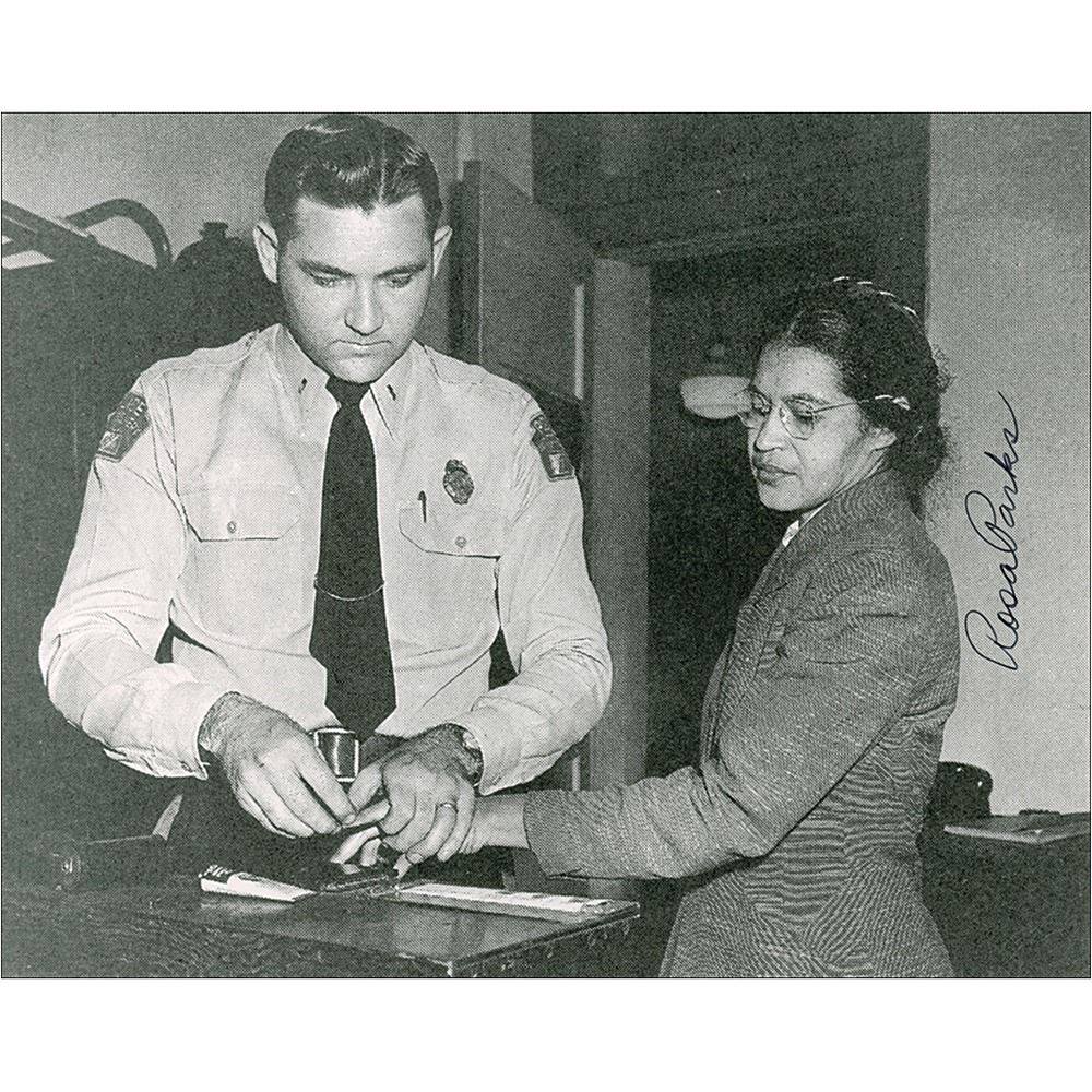 Glossy 10 x 8 photo of Rosa Parks being fingerprinted at the police station, signed in black felt tip. In very fine condition, with a somewhat grainy image quality.