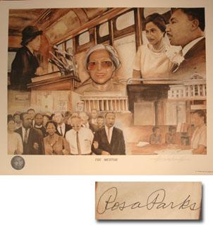 Limited edition poster signed by Rosa Parks. Print features a collage of images pertaining to the Civil Rights movement including Parks marching with Martin Luther King Jr. Each print, limited to 500, is signed by Parks beside her central portrait. The collage artist has signed and numbered each copy in pencil to the lower right. Lower left corner features embossed seal of the Rosa & Raymond Parks Institute. Print accompanied by a photo of Parks during the signing. Rare signed poster measures 18.5'' x 24.5''. Fine condition.