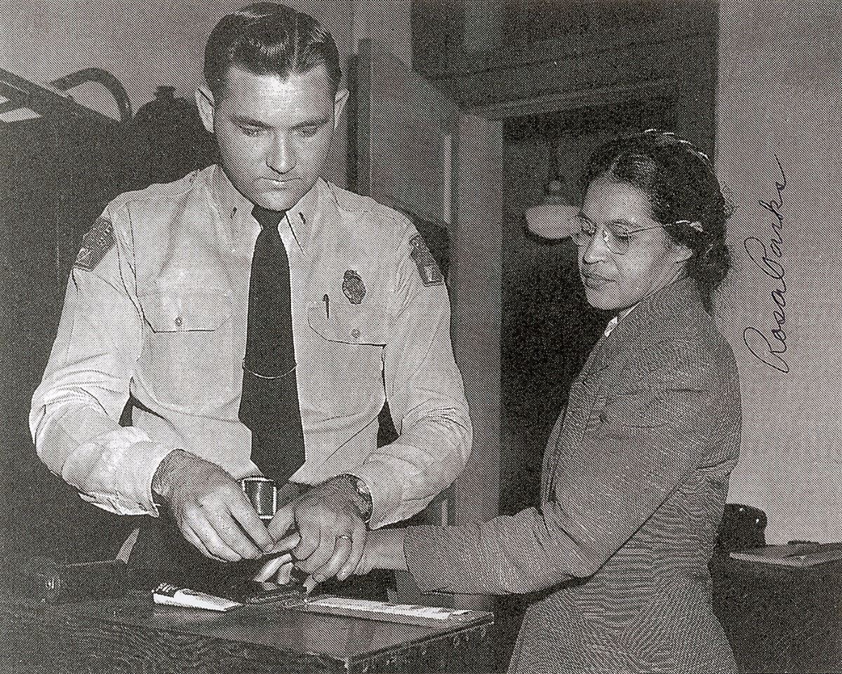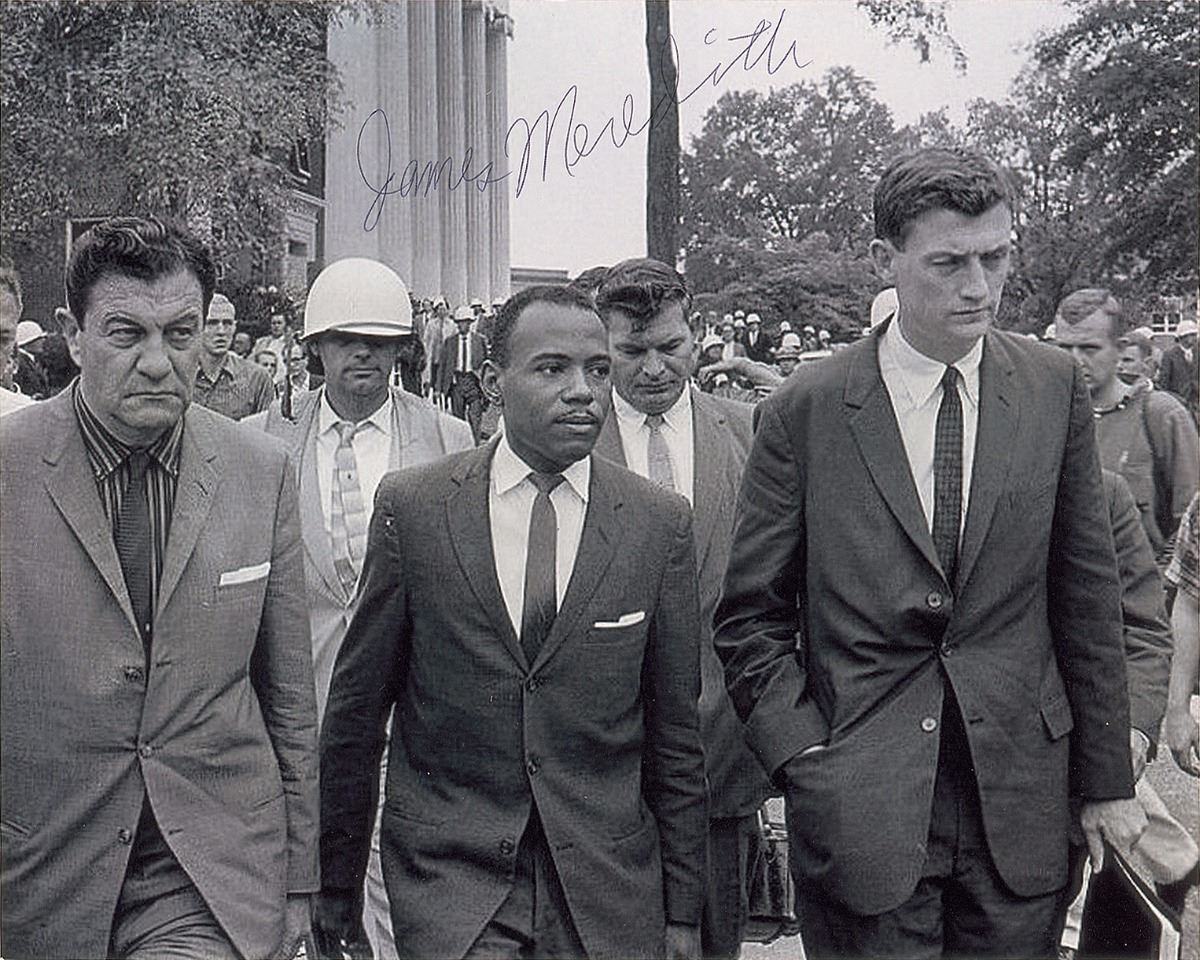 Two photos: a glossy 10 x 8 photo of Rosa Parks having her fingerprints taken by an Alabama police officer, signed vertically in black ink by Parks; and a satin-finish 10 x 8 photo of James Meredith being escorted to class by Chief US Marshal James McShane and Assistant Attorney General for Civil Rights John Doar, signed in black ballpoint by Meredith. In overall fine condition.