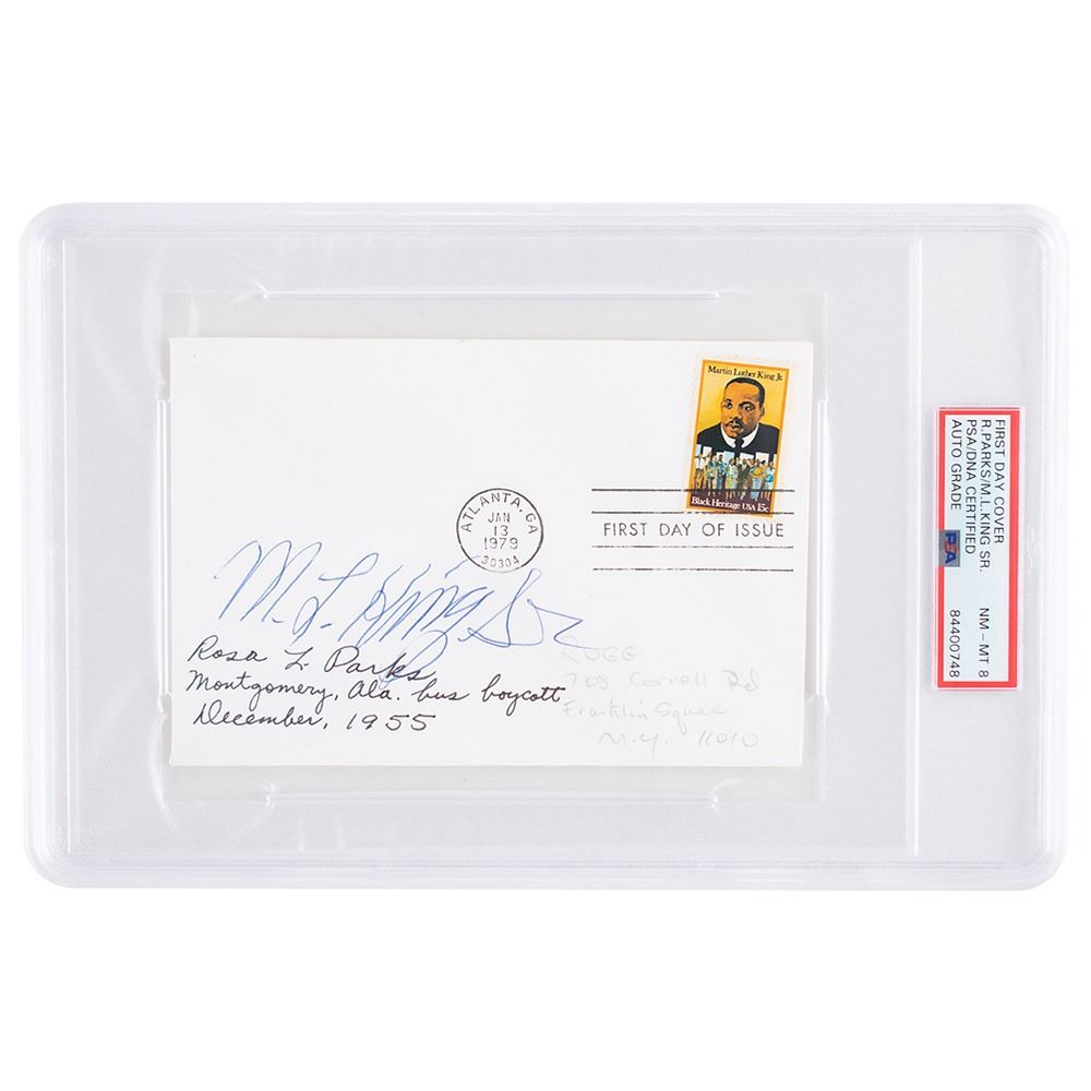 FDC honoring the issuance of the 1979 stamp depicting Martin Luther King, Jr., signed in blue ballpoint by his father, "M. L. King, Sr.," and in black felt tip by a fellow Civil Rights activist, "Rosa L. Parks, Montgomery Ala. bus boycott, December, 1955." In fine condition. Encapsulated and graded by PSA/DNA as "NM-MT 8." A superb autographed piece honoring MLK's legacy.