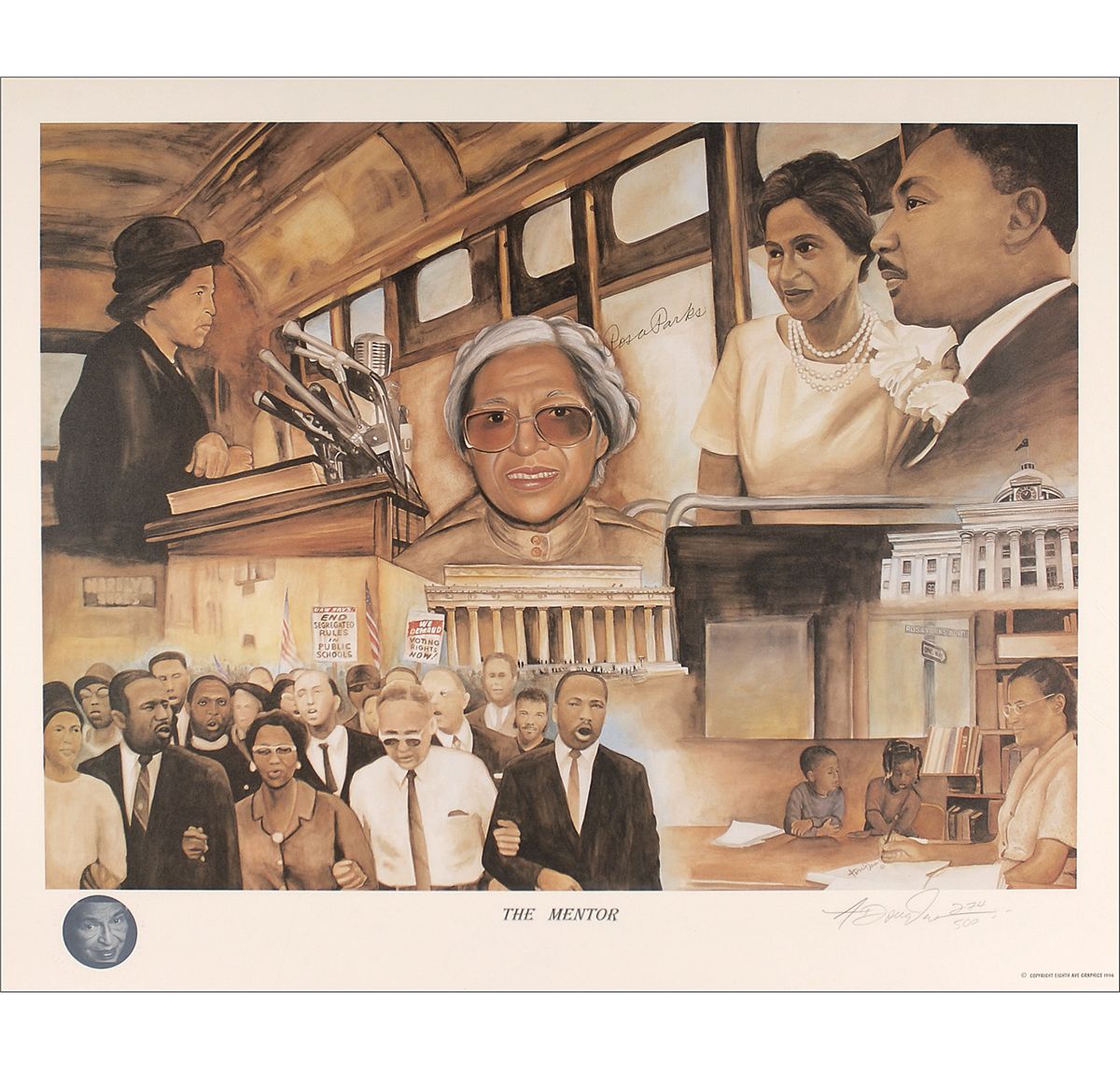 Color limited edition 24 x 19.5 lithograph entitled The Mentor, numbered #274/500, signed in black ink. Also signed in pencil by the artist, Anthony Douglas. Rolled and in fine condition. Accompanied by two photos taken at time of signing. Embossed with a seal of the Parks Legacy and The Rosa Raymond Institute, this piece of art boasts a wonderful rendition of Parks and the achievements that changed a nation.
