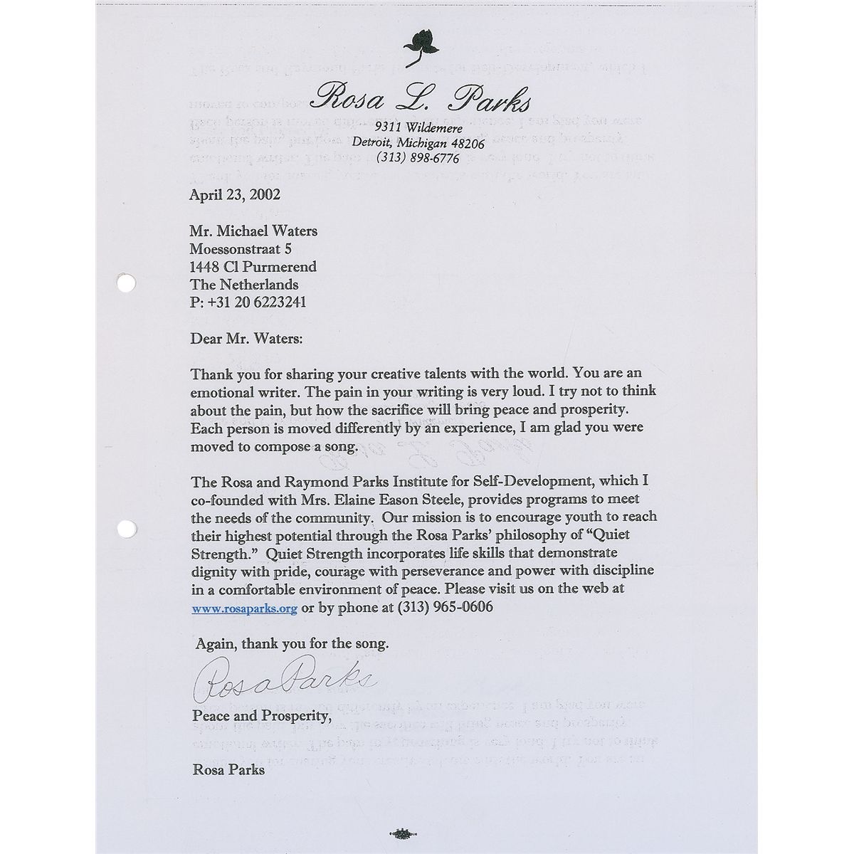 TLS, one page, 8.5 x 11, personal letterhead, April 23, 2002. Letter to a supporter. In part: “You are an emotional writer. The pain in your writing is very loud. I try not to think about the pain, but how the sacrifice will bring peace and prosperity. Each person is moved differently by an experience. I am glad you were moved to compose a song…Quiet Strength incorporates life skills that demonstrate dignity with pride, courage with perseverance and power with discipline in a comfortable environment of peace.” In fine condition, with two punch holes to left edge and some light mirroring of text.