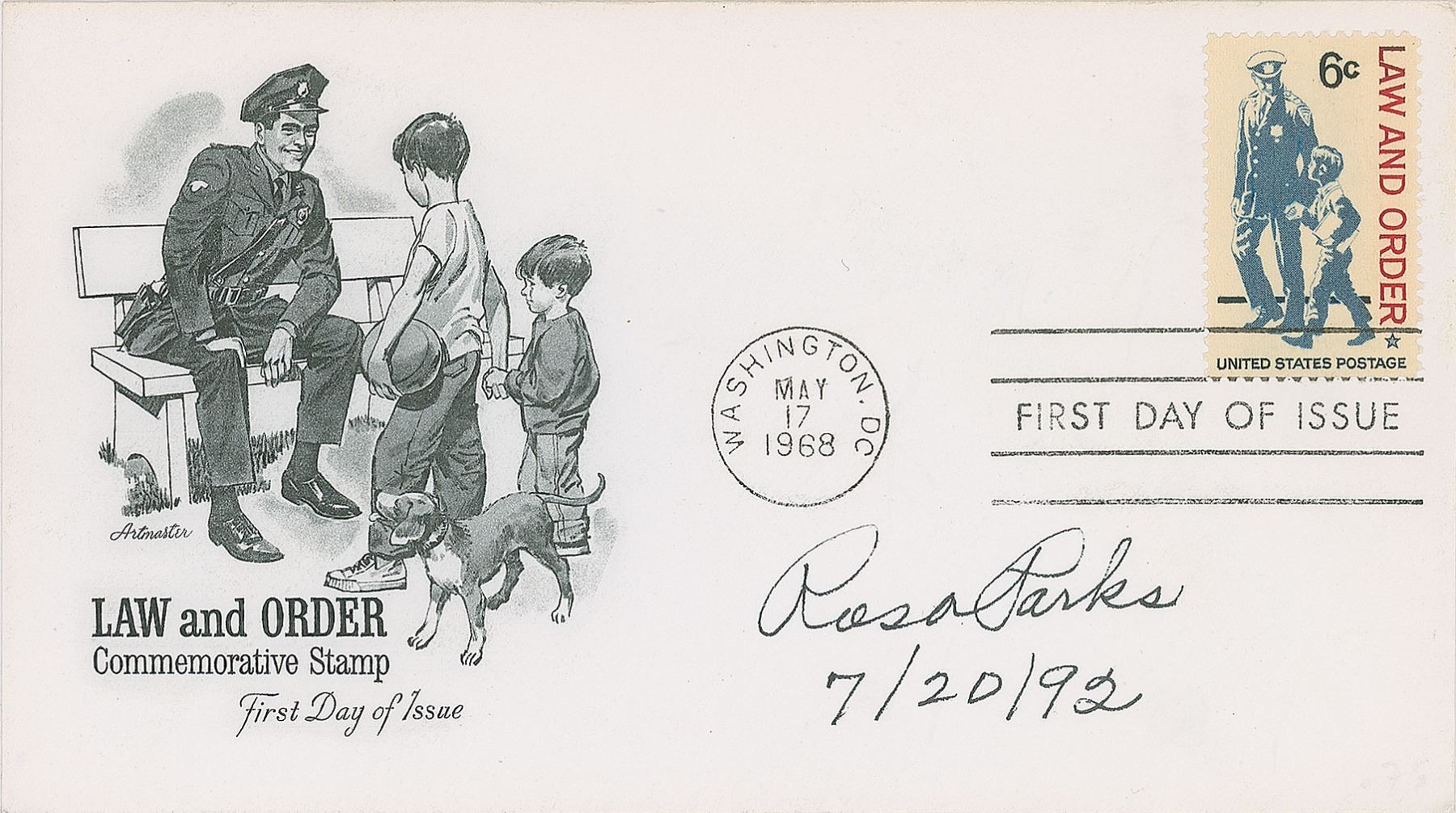 FDC with a cachet honoring 'Law and Order,' depicting a police officer speaking with two small boys, signed in black ink, "Rosa Parks, 7/20/92." In very fine condition.