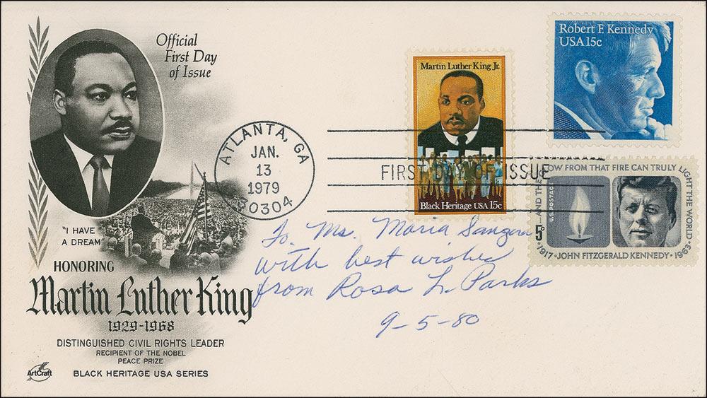 FDC with a cachet honoring Martin Luther King, signed and inscribed in blue ballpoint, “To Ms. Maria Sangera, with best wishes from Rosa L. Parks 9-5-80.” In very fine condition. RRAuction COA.