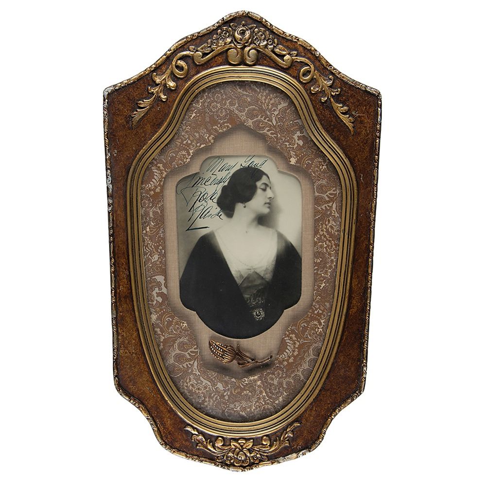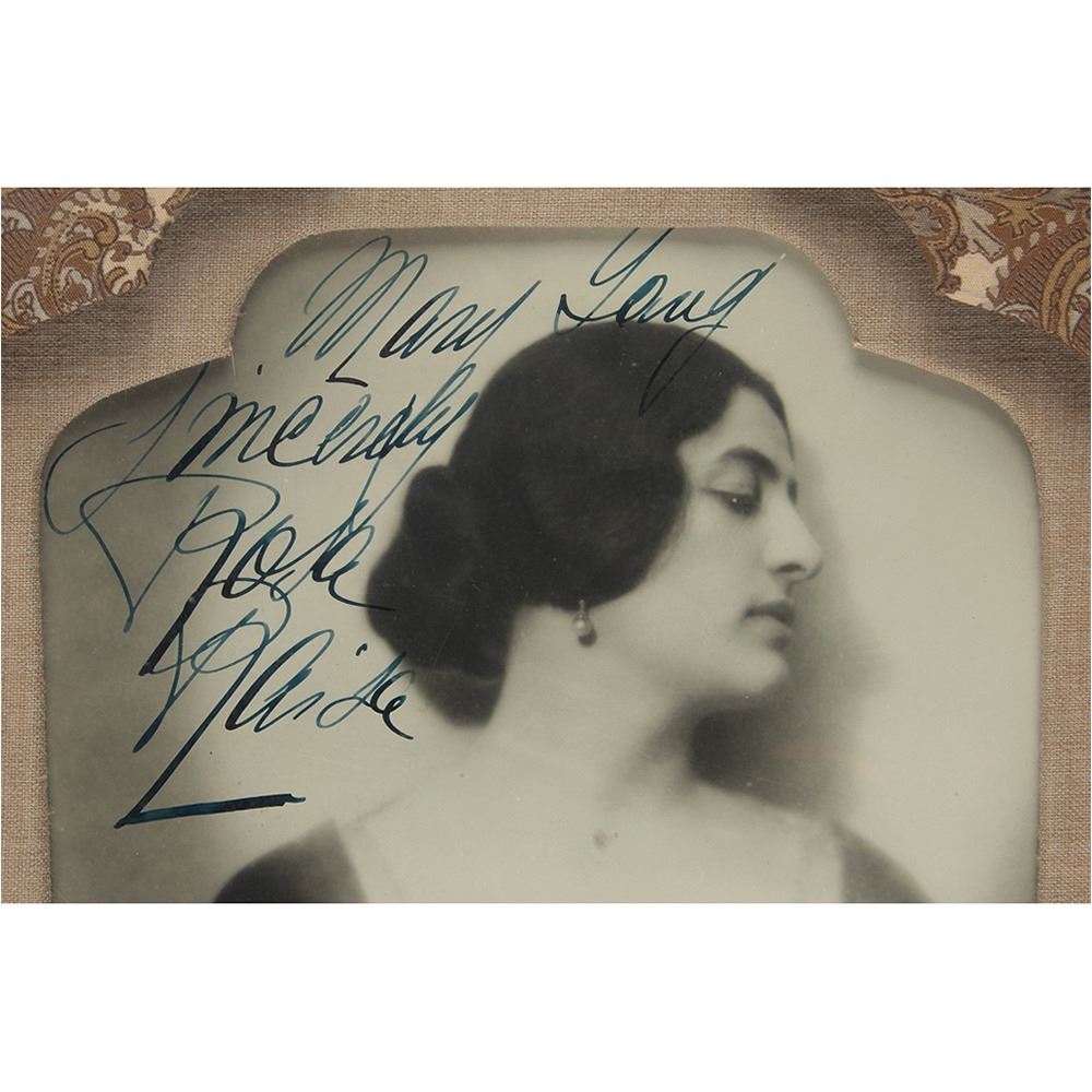 Celebrated dramatic operatic soprano (1893–1963) who was the creator of the title role of Puccini's last opera, Turandot, at La Scala, Milan. Vintage matte-finish 5.25 x 7.75 bust portrait of the lovely soprano, signed and inscribed in fountain pen, "Mary Long, sincerely, Rosa Raisa.” Impressively matted and framed with a lovely brooch attributed to Raisa's personal collection to an overall size of 12 x 20. In fine condition. Provenance: Anna Sosenko, an impresario who had a well-known autograph boutique in NYC in the 1980s.