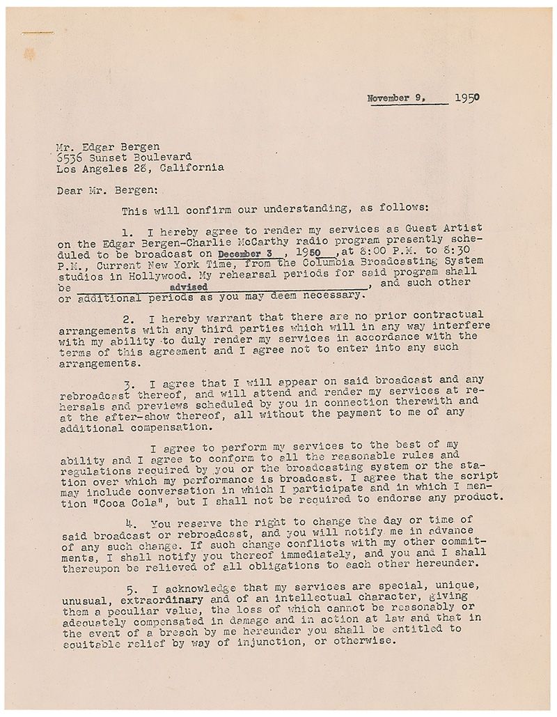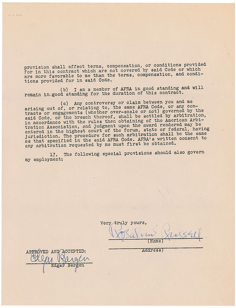 DS, four pages, 8.5 x 11, November 9, 1950. Russell agrees to appear on the Edgar Bergen–Charlie McCarthy radio program for a fee of $1000, also agreeing not to appear on any other radio show for a period of seven days. Signed on the last page by Russell and Bergen. In fine condition, with staple hole to top left of each page and some scattered light toning and creasing.