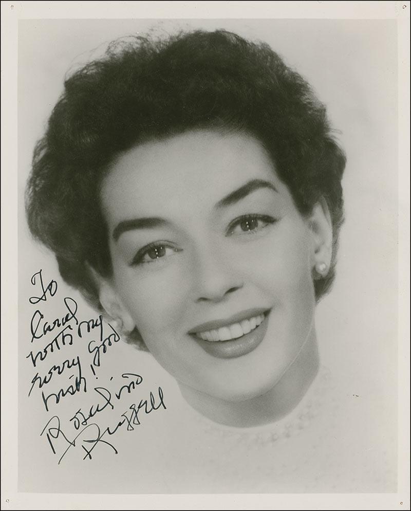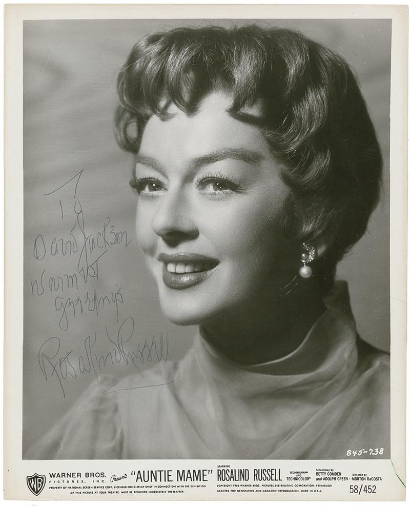 Two signed photos: vintage glossy 8 x 10 Warner Brothers promotional photo for Auntie Mame signed and inscribed in ballpoint; vintage glossy 8 x 10 photo signed and inscribed in fountain pen. In fine condition, with surface scuff near Russell’s neck, light impressions over signature from her signing another item on top of this promotional photo, and stray green ink mark to bottom right; light overall surface marks and single tack hole to each corner of the other photo.