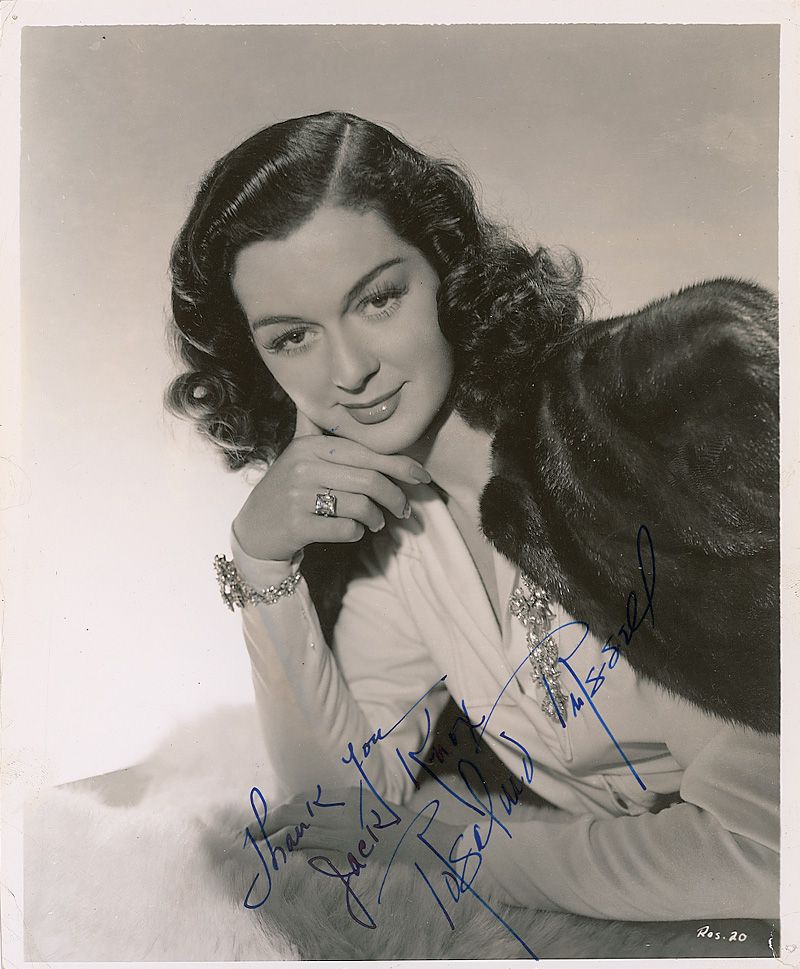 Vintage glossy 7.75 x 9.5 photo, signed and inscribed in fountain pen “Thank you Jack Knox, Rosalind Russell.” In very good condition, with trimmed edges, a tack hole to two corners, some scattered creases, and some light rippling to finish.