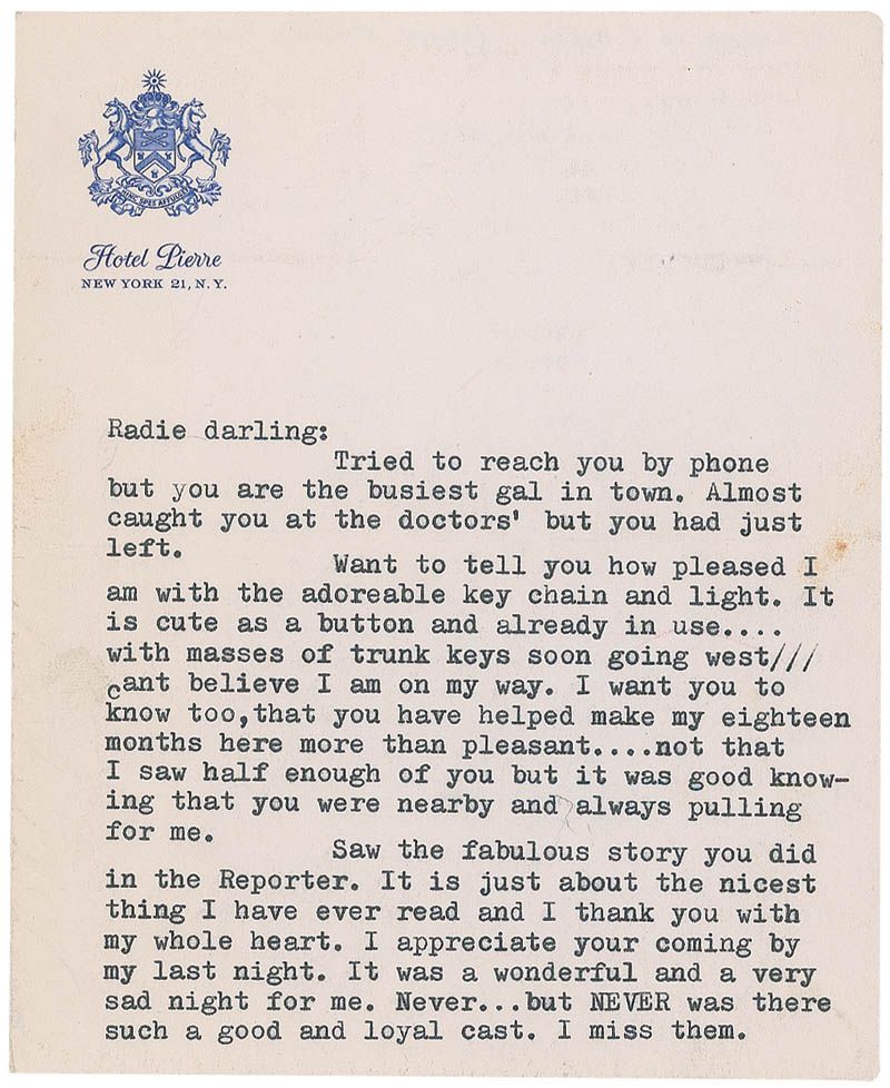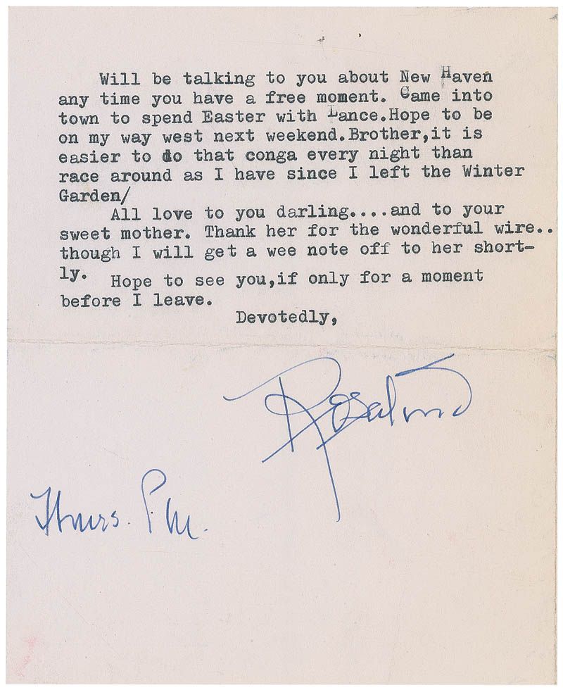 TLS signed “Rosalind,” two pages on two adjoining sheets, 5.25 x 6.5, Hotel Pierre letterhead, no date. Letter to journalist Radie Harris. In part: “Tried to reach you by phone but you are the busiest gal in town...Saw the fabulous story you did in the Reporter. It is just about the nicest thing I have ever read and I thank you with my whole heart.” In fine condition.