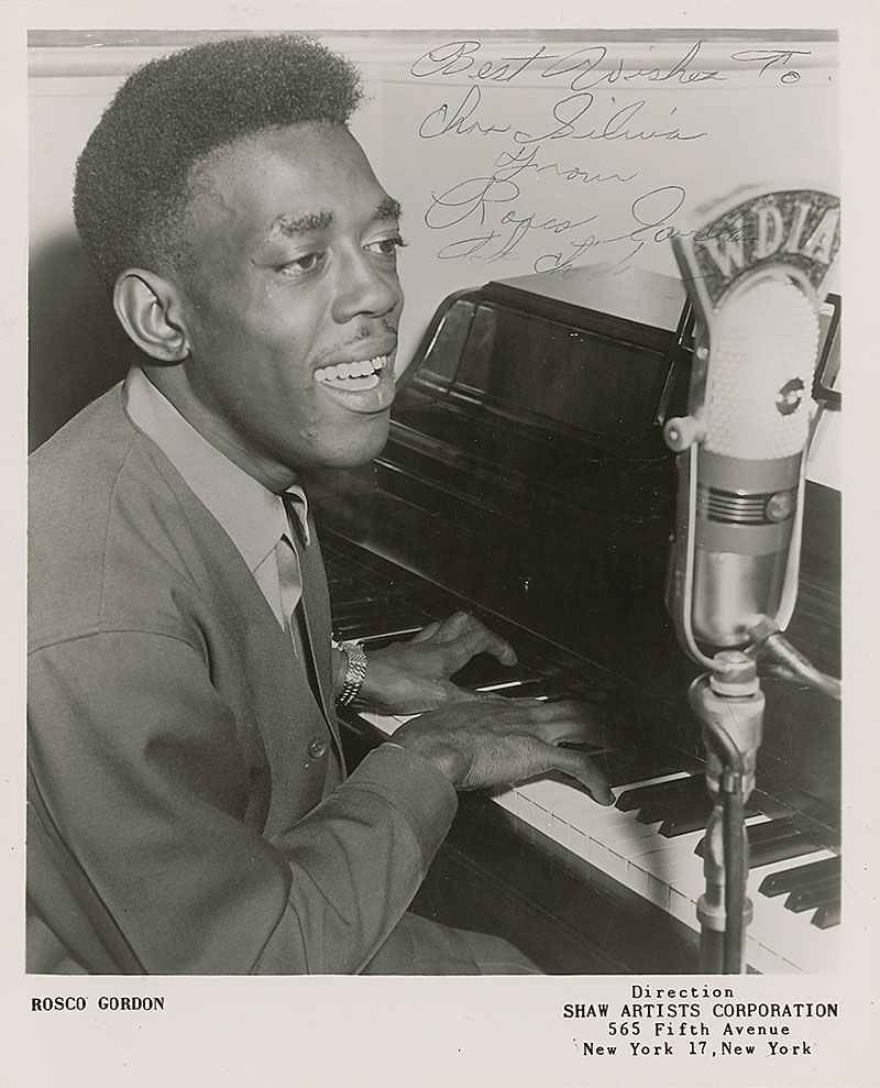 American blues singer and songwriter (1928–2002). Glossy 8 x 10 publicity photo of Gordon making a recording, signed and inscribed in black ballpoint, “Best wishes to Chas Silvia, from Rosco Gordon.” In fine condition.