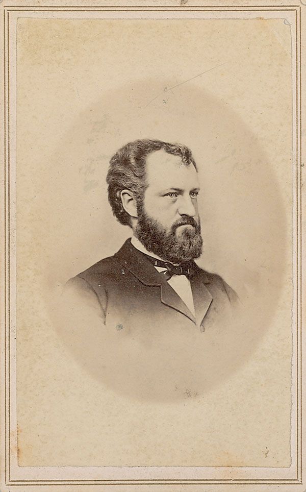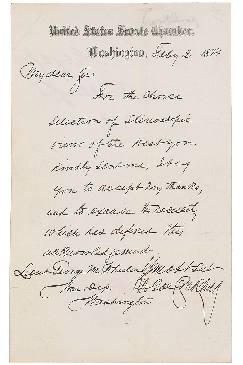 LS, one page, 5 x 8, US Senate Chamber letterhead, February 2, 1874. Letter to Lieutenant George M. Wheeler. In part: “For the choice selection of stereoscopic views of the West you kindly sent me, I beg you to accept my thanks.” Intersecting folds (one vertical fold passing through a single letter of the signature), a few creases, and small tear to left edge, otherwise fine condition. Accompanied by an unsigned original carte-de-visite bust portrait.