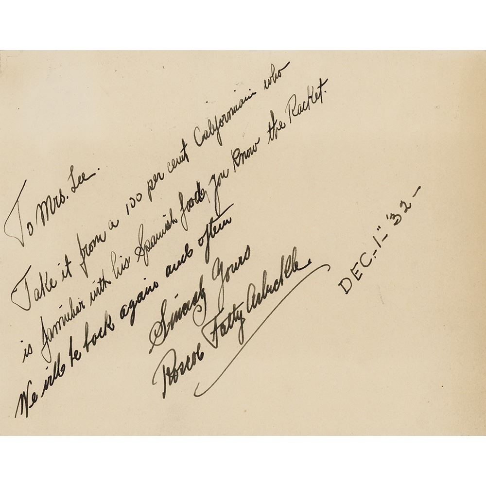 Vintage fountain pen signature and inscription, "To Mrs. Lee, Take it from a 100 per cent Californian who is familiar with his Spanish food, you know the Racket. We will be back again and often. Sincerely yours, Roscoe Fatty Arbuckle, Dec. 1, '32,” on an off-white 8.25 x 6.5 sheet. In very fine condition.