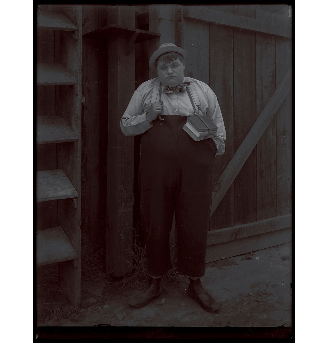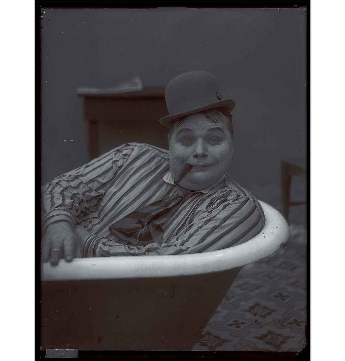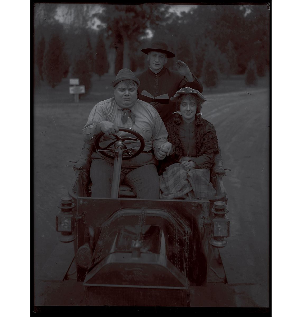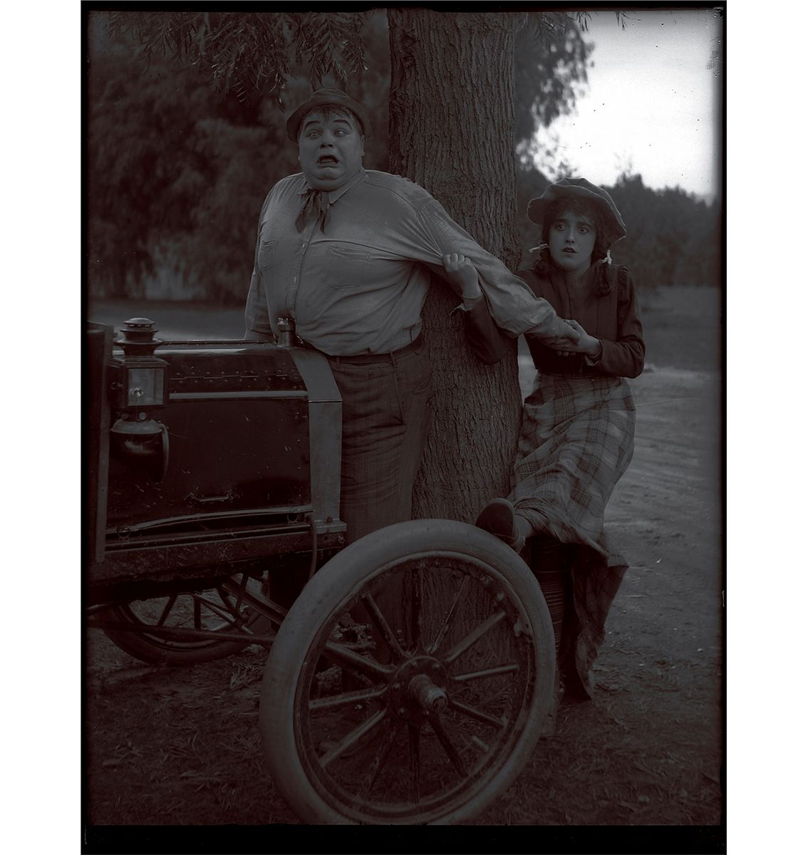 Collection of eight glass negatives, 6.5 x 8.5 and 8.5 x 6.5, seven of Arbuckle and one of Conklin. Images include one of Arbuckle and Mabel Normand, the comedian as a schoolboy, one of Arbuckle pinned to a tree by a car, and toiling with laundry duties. The full-length image of Conklin, clad in baggy chaps, is most likely from the 1914 film Wild West Love. Scattered surface marks and scratches, otherwise fine condition.