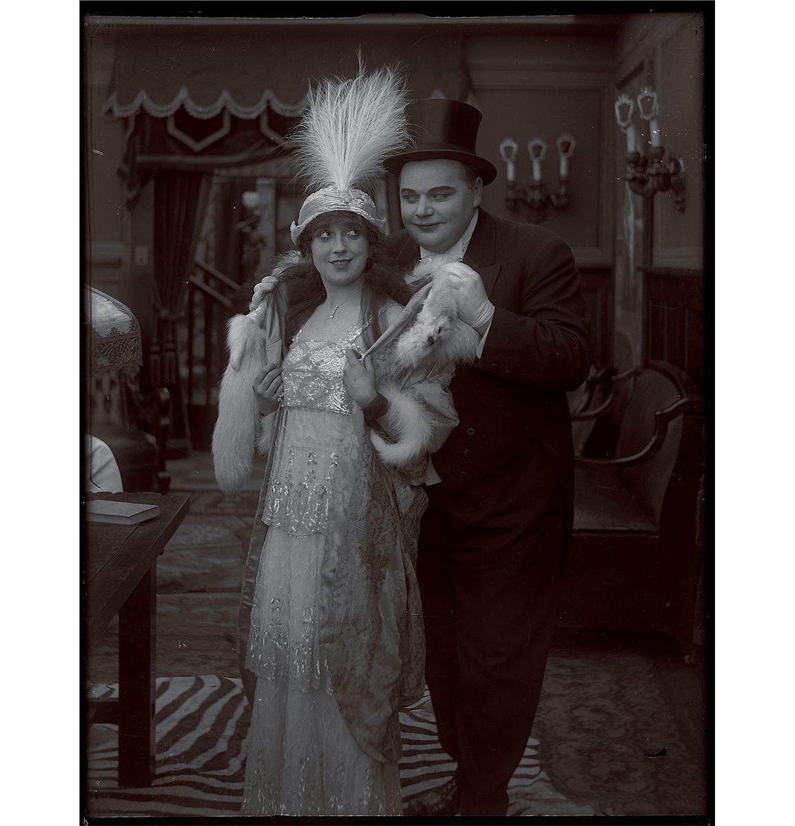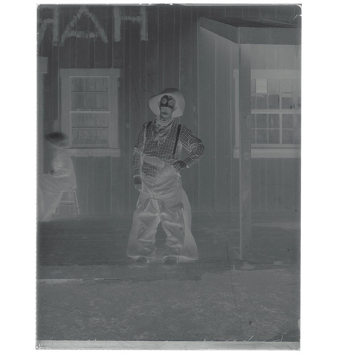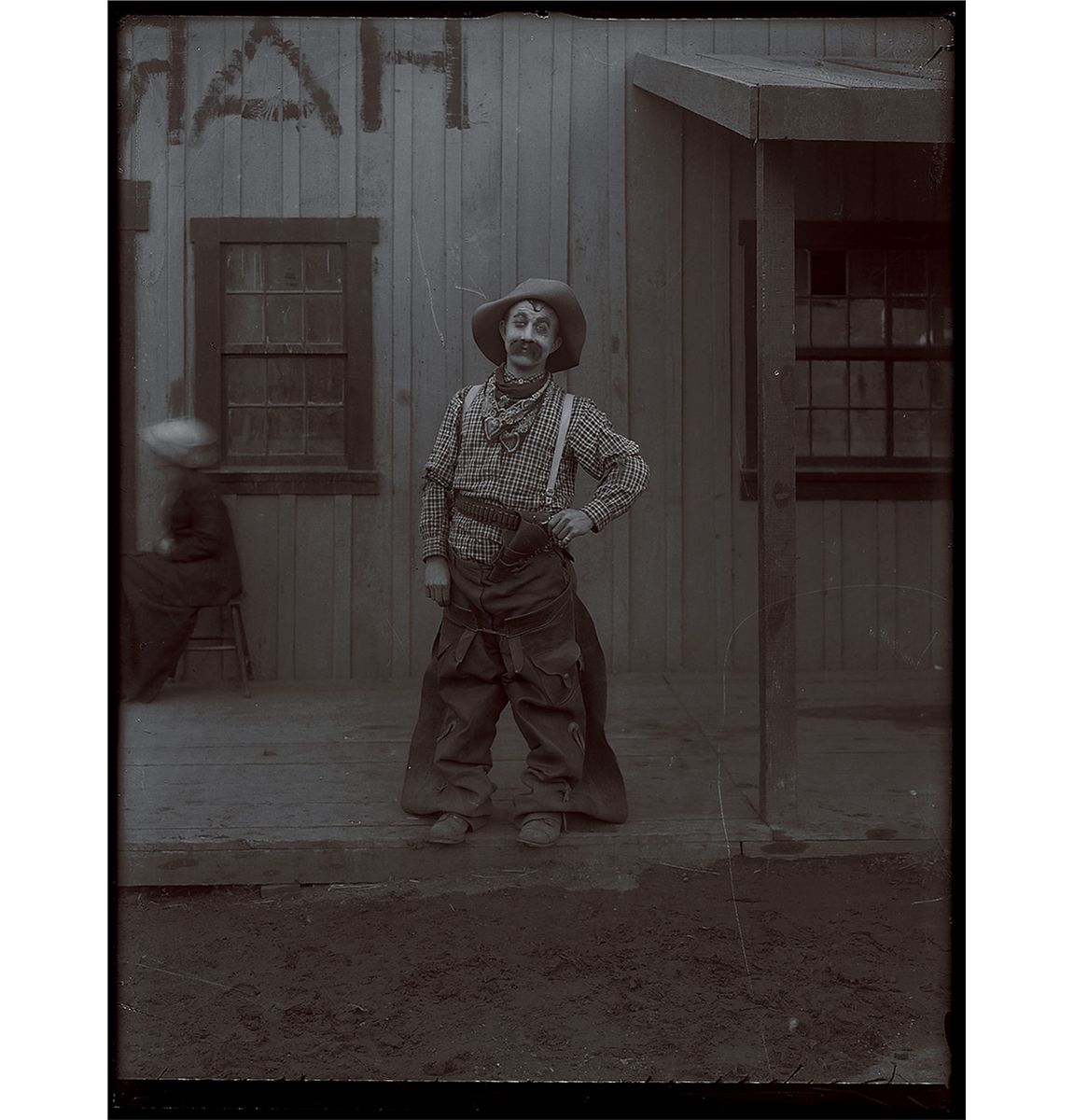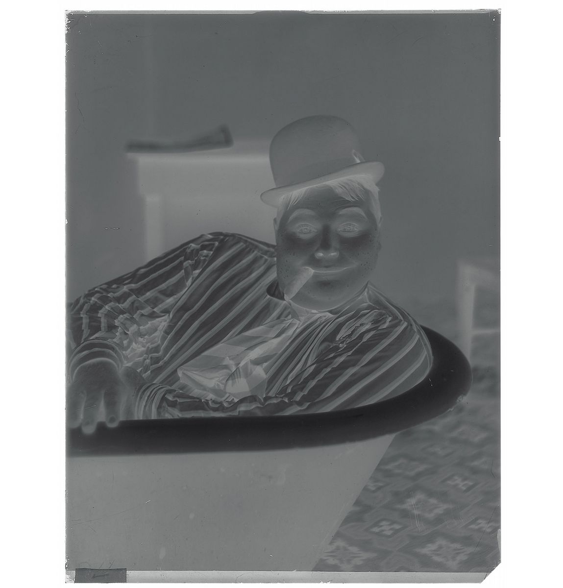 Collection of eight glass negatives, 6.5 x 8.5 and 8.5 x 6.5, seven of Arbuckle and one of Conklin. Images include one of Arbuckle and Mabel Normand, the comedian as a schoolboy, one of Arbuckle pinned to a tree by a car, and toiling with laundry duties. The full-length image of Conklin, clad in baggy chaps, is most likely from the 1914 film Wild West Love. Scattered surface marks and scratches, otherwise fine condition.