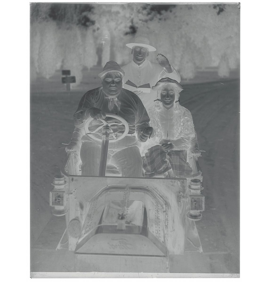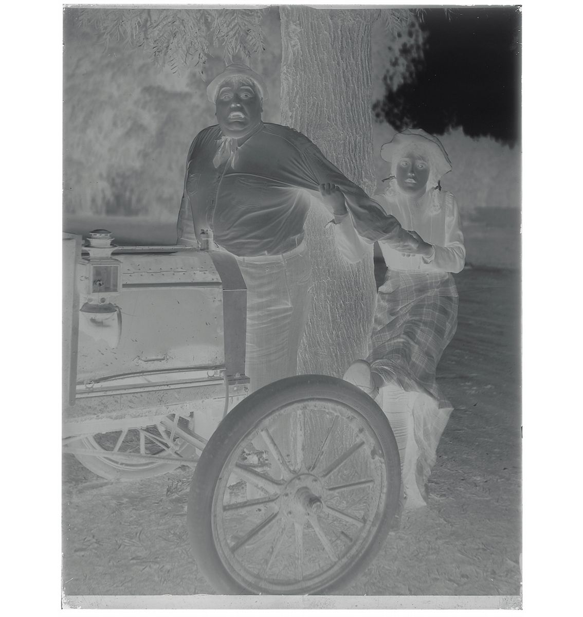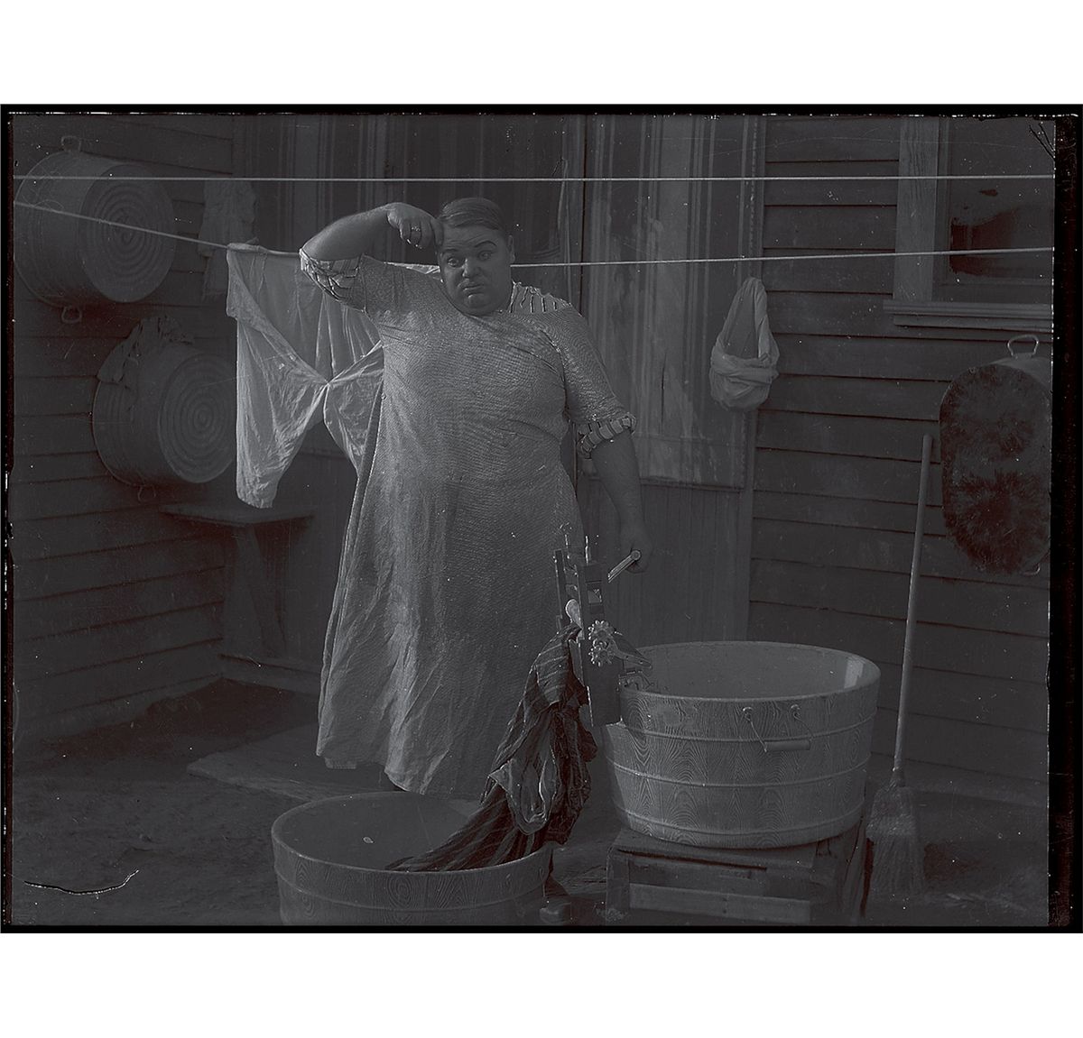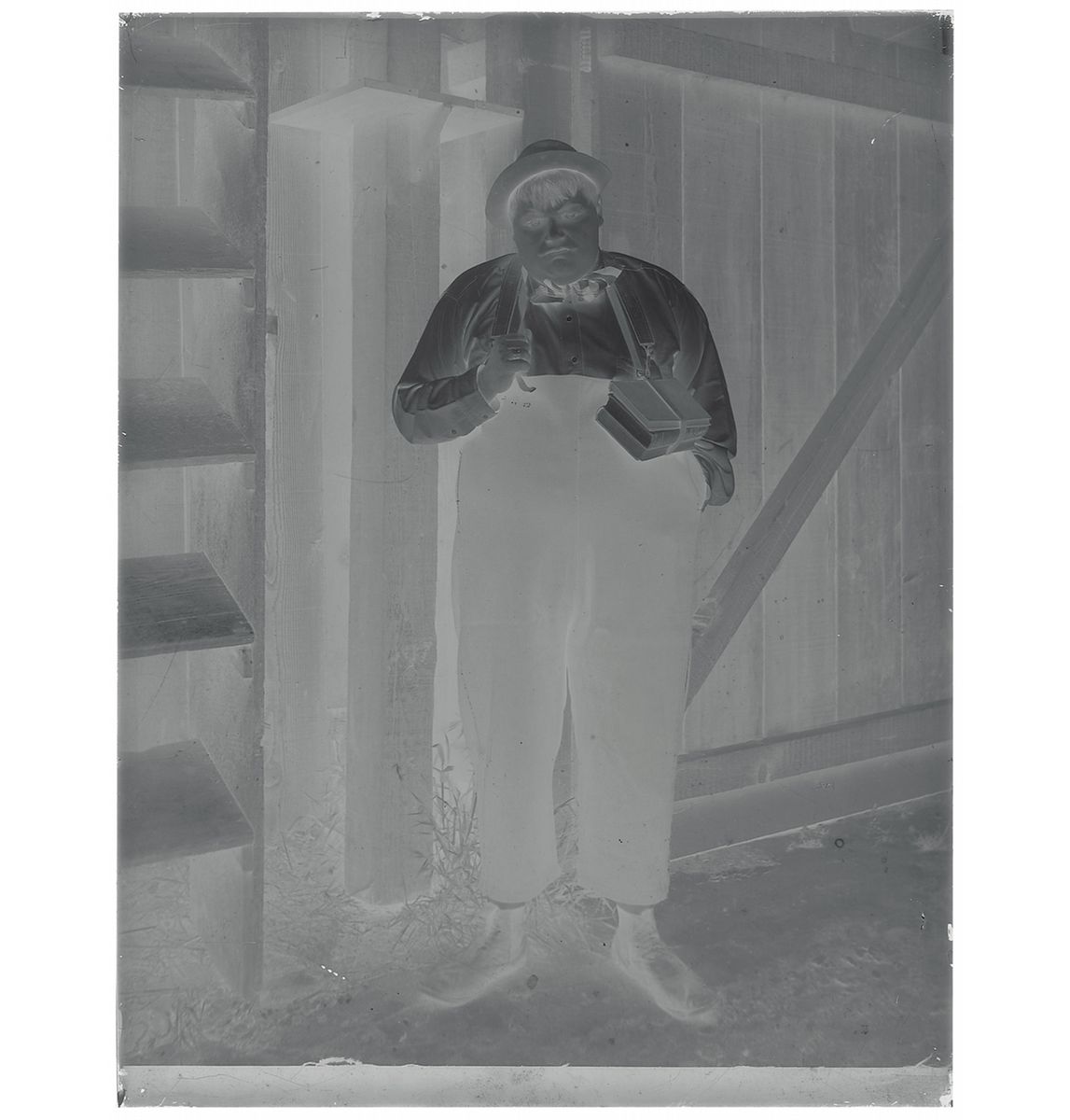 Collection of eight glass negatives, 6.5 x 8.5 and 8.5 x 6.5, seven of Arbuckle and one of Conklin. Images include one of Arbuckle and Mabel Normand, the comedian as a schoolboy, one of Arbuckle pinned to a tree by a car, and toiling with laundry duties. The full-length image of Conklin, clad in baggy chaps, is most likely from the 1914 film Wild West Love. Scattered surface marks and scratches, otherwise fine condition.