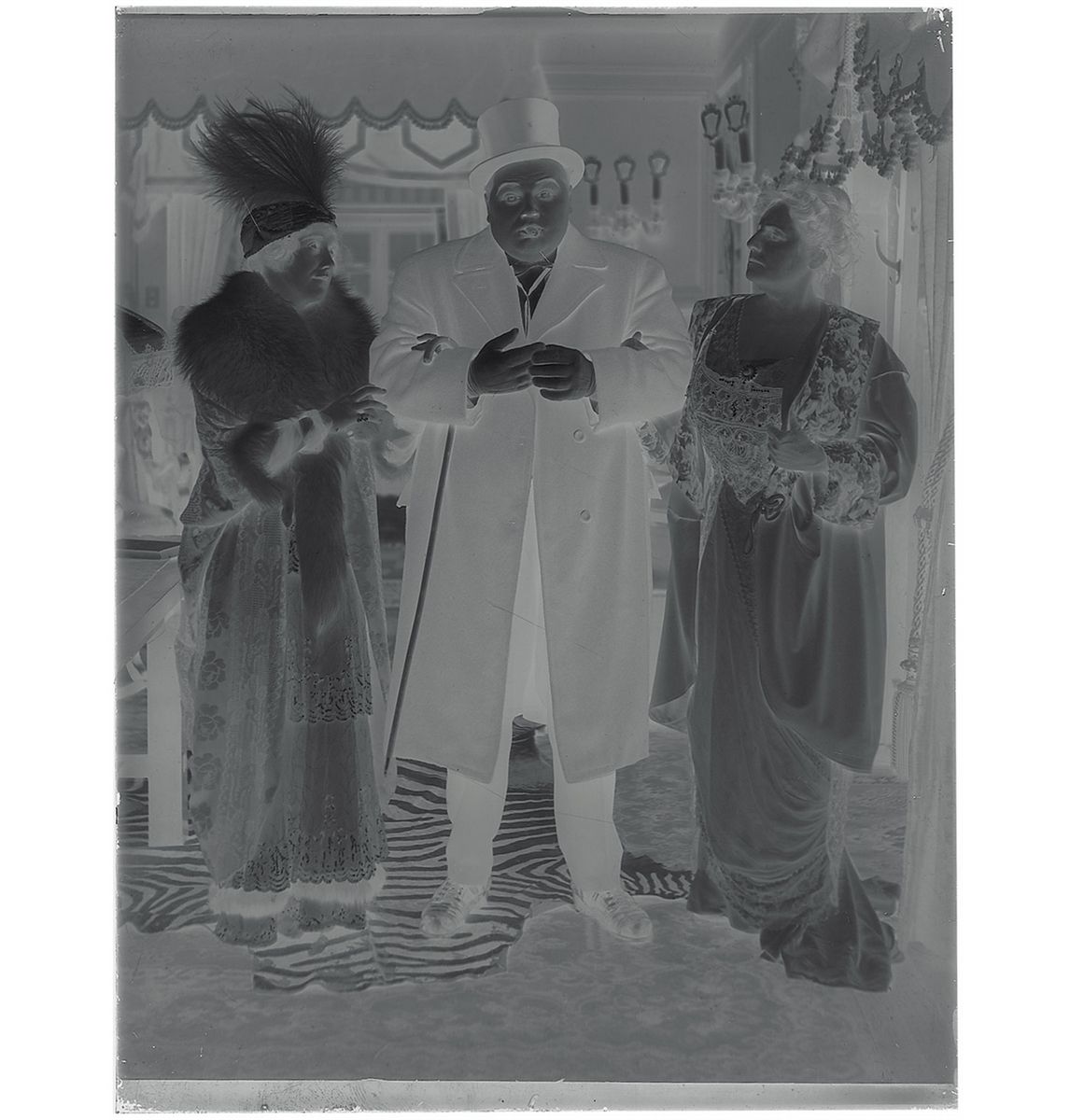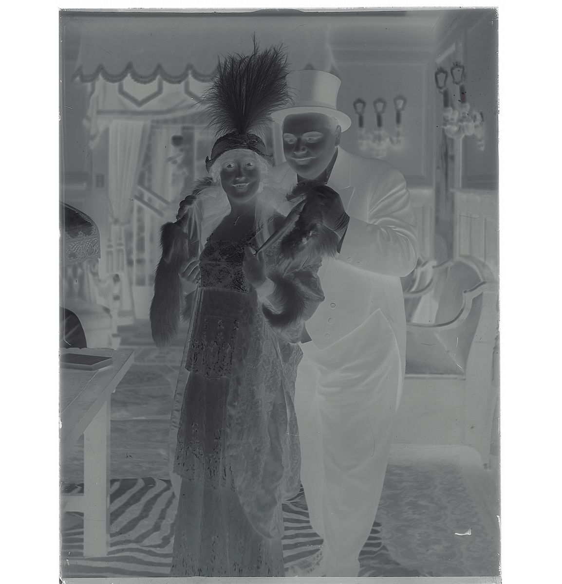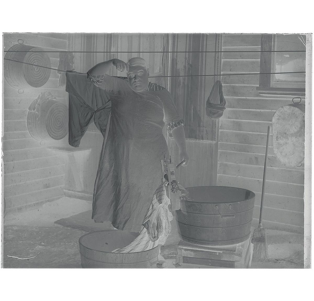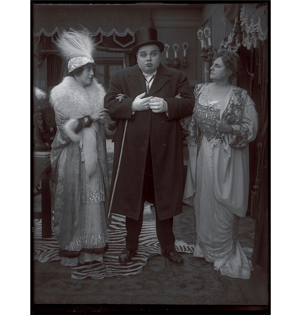 Collection of eight glass negatives, 6.5 x 8.5 and 8.5 x 6.5, seven of Arbuckle and one of Conklin. Images include one of Arbuckle and Mabel Normand, the comedian as a schoolboy, one of Arbuckle pinned to a tree by a car, and toiling with laundry duties. The full-length image of Conklin, clad in baggy chaps, is most likely from the 1914 film Wild West Love. Scattered surface marks and scratches, otherwise fine condition.