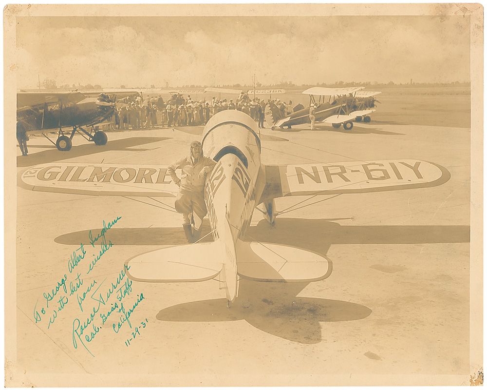 American aviator (1895–1970) who set the east-to-west transcontinental speed record in 1930. Vintage sepia matte-finish 10 x 8 photo of Turner posing with his plane, signed and inscribed in green fountain pen “To George Albert Ingham, with best wishes from Roscoe Turner, Cal. Gaas Staff of California 11-29-31.” Some scattered light toning and soiling, mainly to the corners from mounting remnants on reverse, and a bit of light silvering, otherwise fine condition.