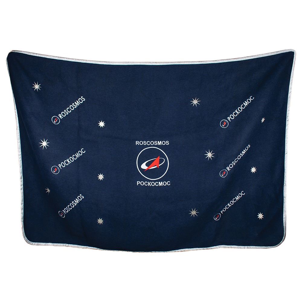 Uncommon large and heavy Roscosmos 100% wool blanket, 55Àù x 82.5Àù, which was designed to warm up Soyuz (ISS) crew members after cold weather landings. The dark navy blue blanket features several silver thread stars and an attractive matching border, as well as repeating patterns of the Roscosmos emblem. In fine condition.