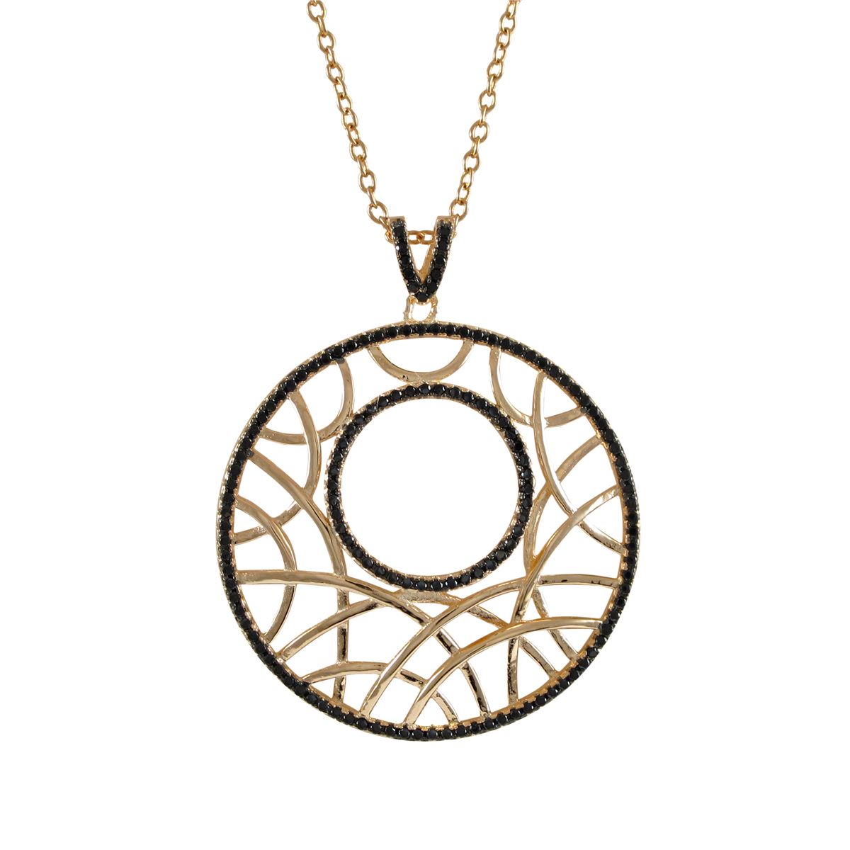 Rose And Black Over Sterling Silver, 35Mm Circle, Line Design With Black CZ Pendant