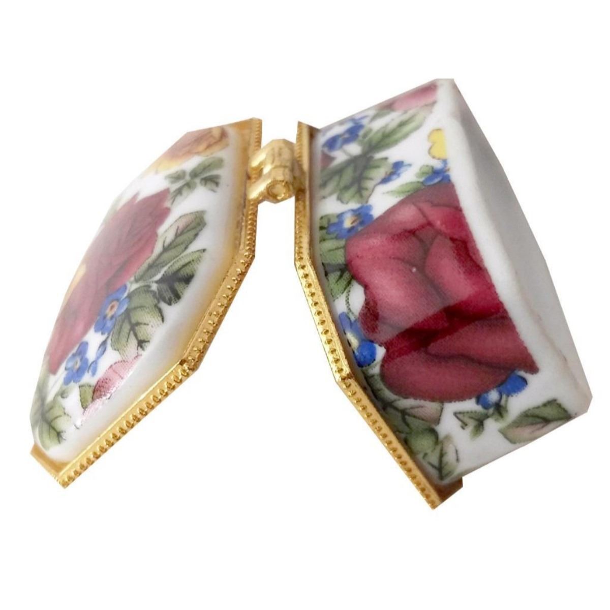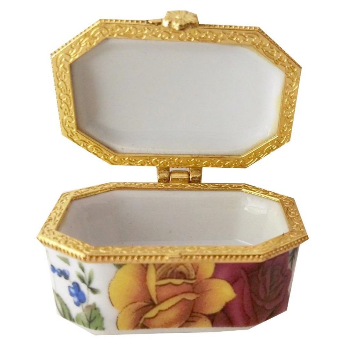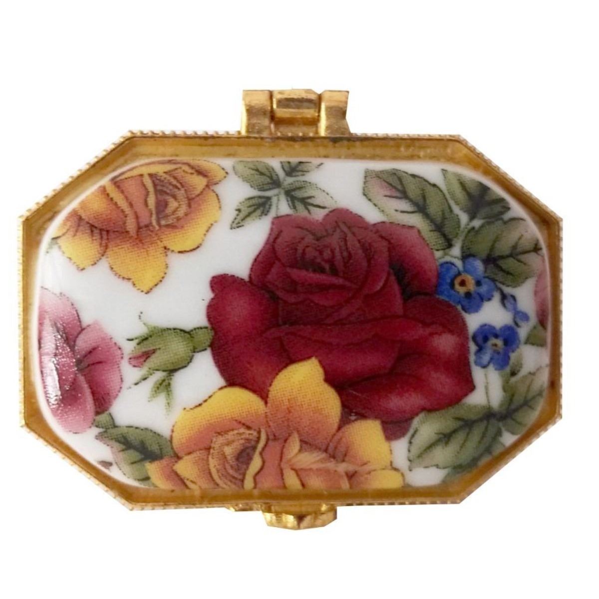 Colorful little rose chintz porcelain jewel or trinket box with brass hinged lid. 2" X 1". 10009-040118-EB-43319