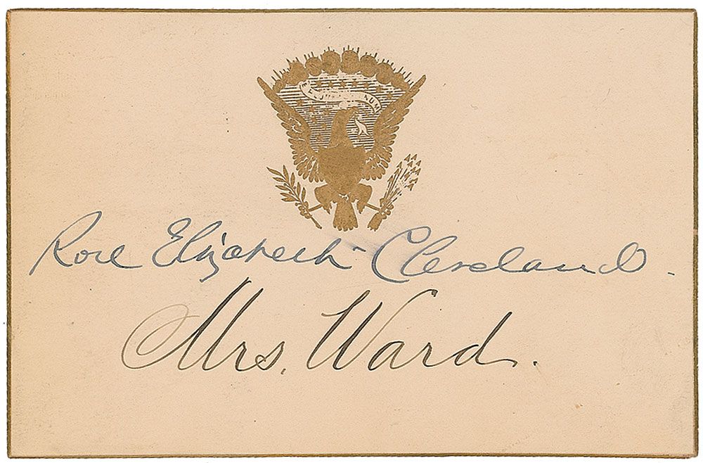 First Lady (1846–1918) during the first of her brother Grover Cleveland's two administrations. Gold embossed place card for a Mrs. Ward, 4.5 x 2.75, with gilt edges and a gold eagle at the top, signed in black ink, “Rose Elizabeth Cleveland.” In fine condition, with some minor soiling and a small brush to last name of signature.
