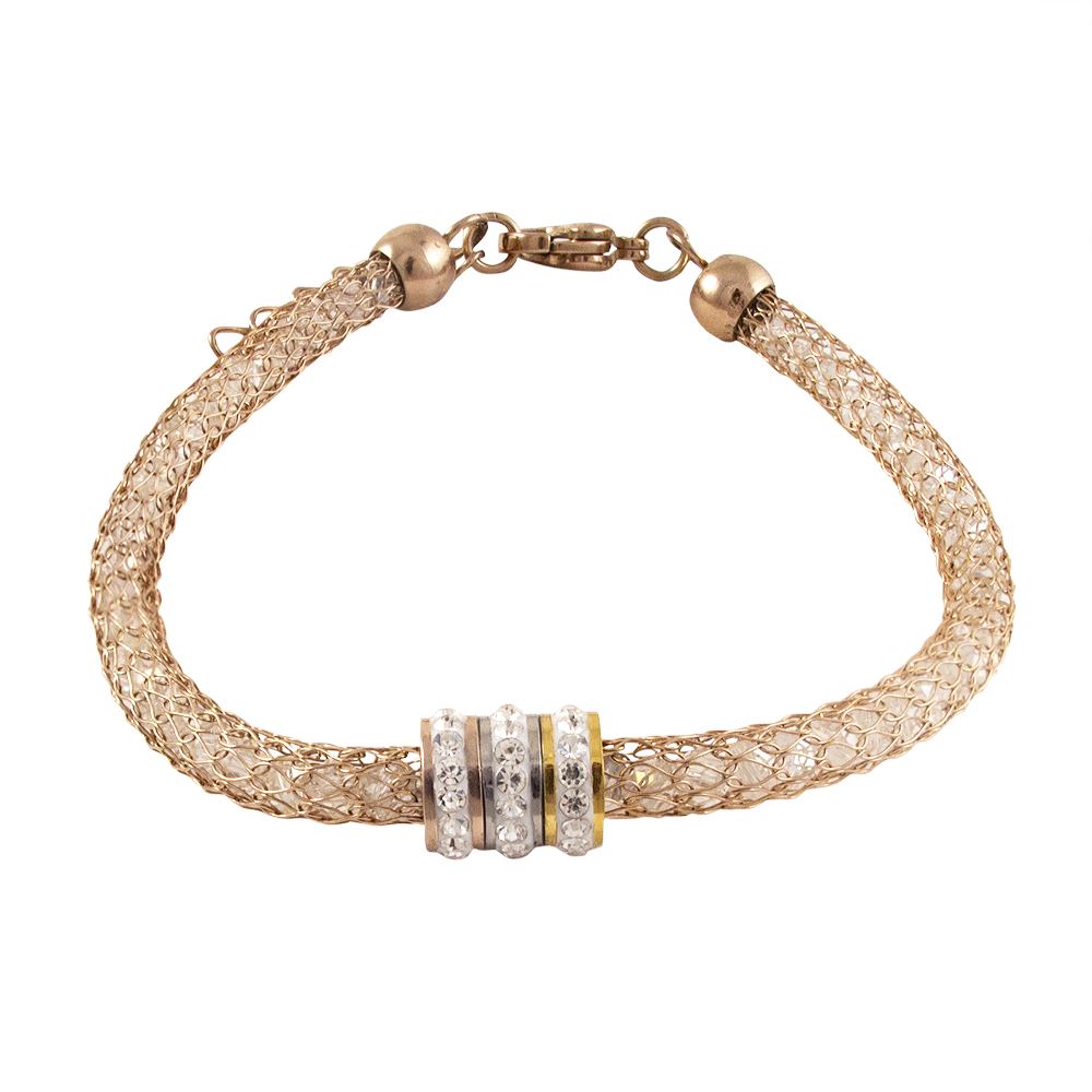 Rose Color Mesh With Beads Bracelet. 3 Round Rondells With White Czs.