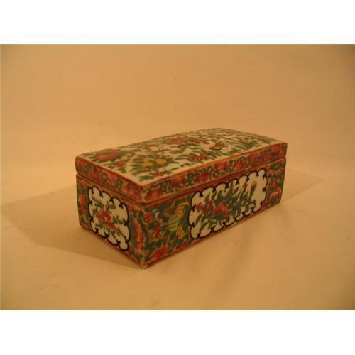 Rose Famille decorated razor box with the proper array of colors for a period piece of export porcelain. This items has the black cartouche which is typical for items made for the Boston market. This raxor box is smaller in size than many razor boxes we have sold. The inside of the box shows traces of the original bronze colored highlight to the center ridge. Great small size measuring 7 1/4 long by 3 1/2 wide by 2 1/2 deep. Perfect condition - no chips or blemishes.