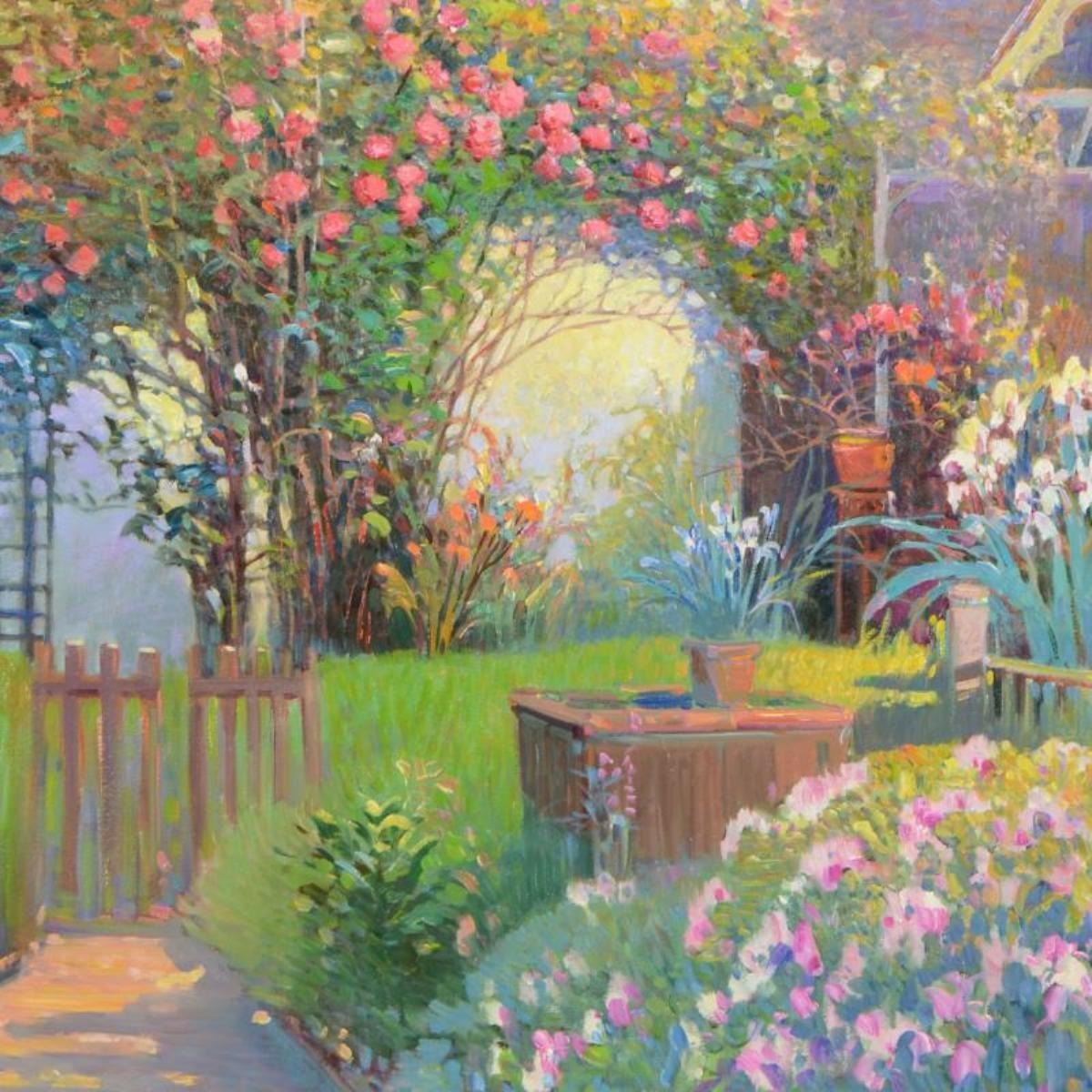 Rose Garden by Feng Original. "Rose Garden" is an original oil painting on canvas by Ming Feng, hand signed by the artist. This piece comes framed. Includes Letter of Authenticity. Measures approx. 29.5" x 35.5" (frame), 23.5" x 29.5" (image). There is minor wear on the frame.