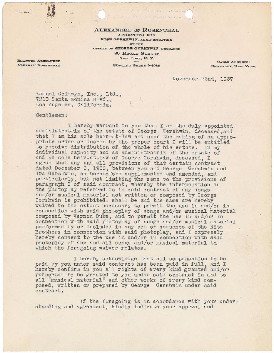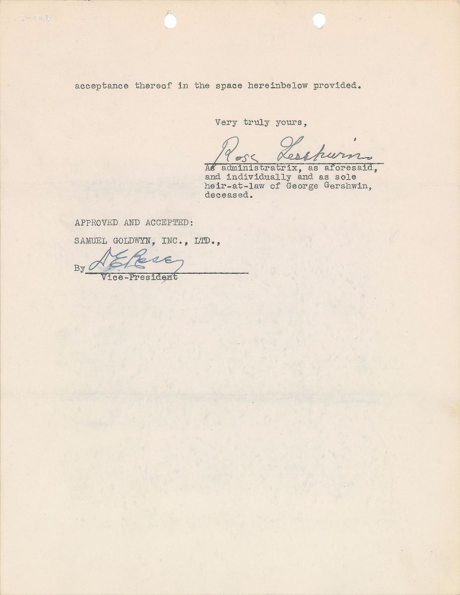 DS, two pages, 8.5 x 11, November 22, 1937. Permission statement regarding a prior photoplay contract, in part: “I hereby warrant to you that I am the duly appointed administratrix…of George Gershwin…and that I am his sole heir-at-law…and I will be entitled to receive distribution of the whole of his estate…I agree that that any and all provisions of that certain contract dated December 3, 1936, between you and George Gershwin and Ira Gershwin…shall be and the same hereby waived to the extent necessary to permit the use…in connection with said photoplay of songs and/or musical material composed by Vernon Duke…and to permit…in any act or sequence of the Ritz Brothers in connection with said photoplay.” Signed at the conclusion in fountain pen by Rose Gershwin, and countersigned by Samuel Goldwyn Vice President David E. Rose. In fine condition, with a horizontal fold and rust mark along top edge. Dated just four months after Gershwin’s untimely death, this document is in reference to the 1938 film The Goldwyn Follies, Gershwin’s final film score which Victor Duke was commissioned to finish before its release. Gershwin received a posthumous Oscar nomination for the score.
