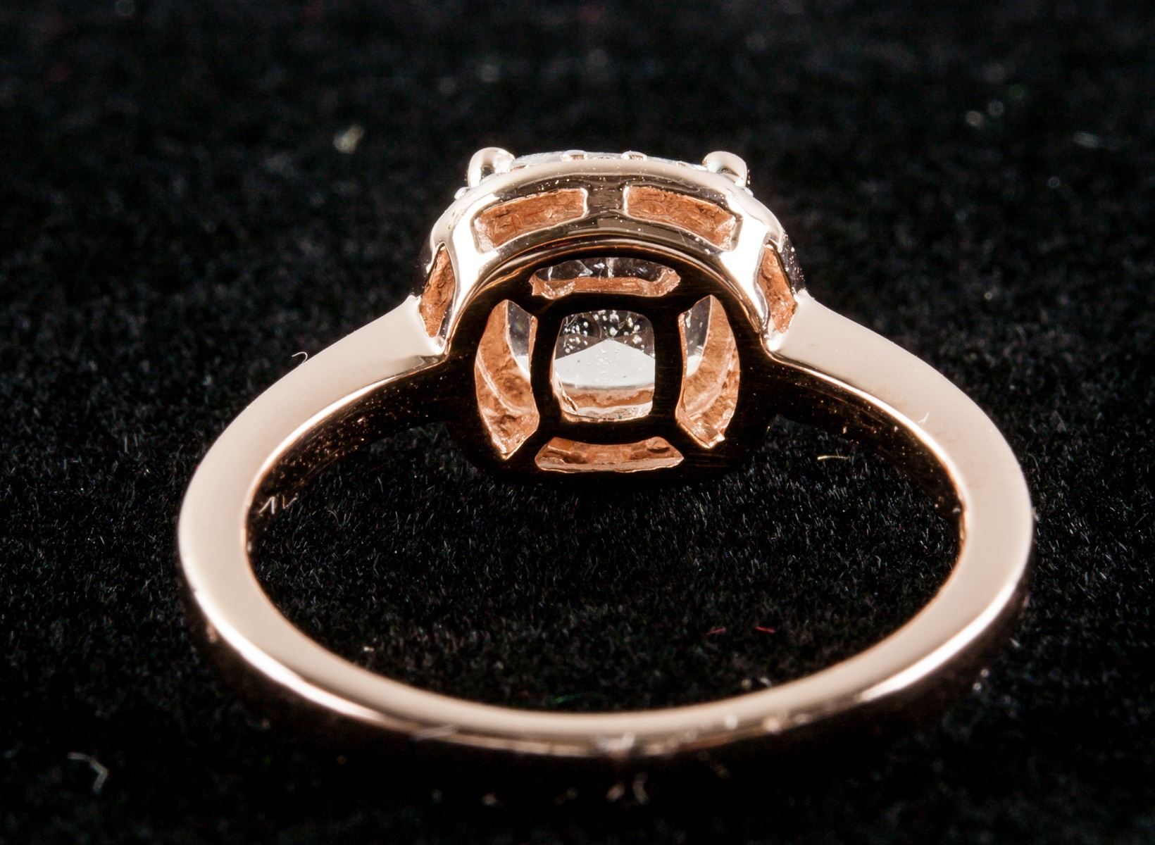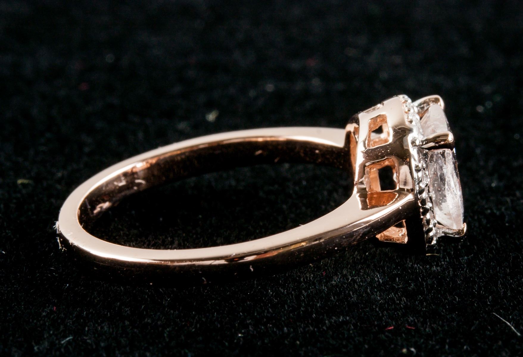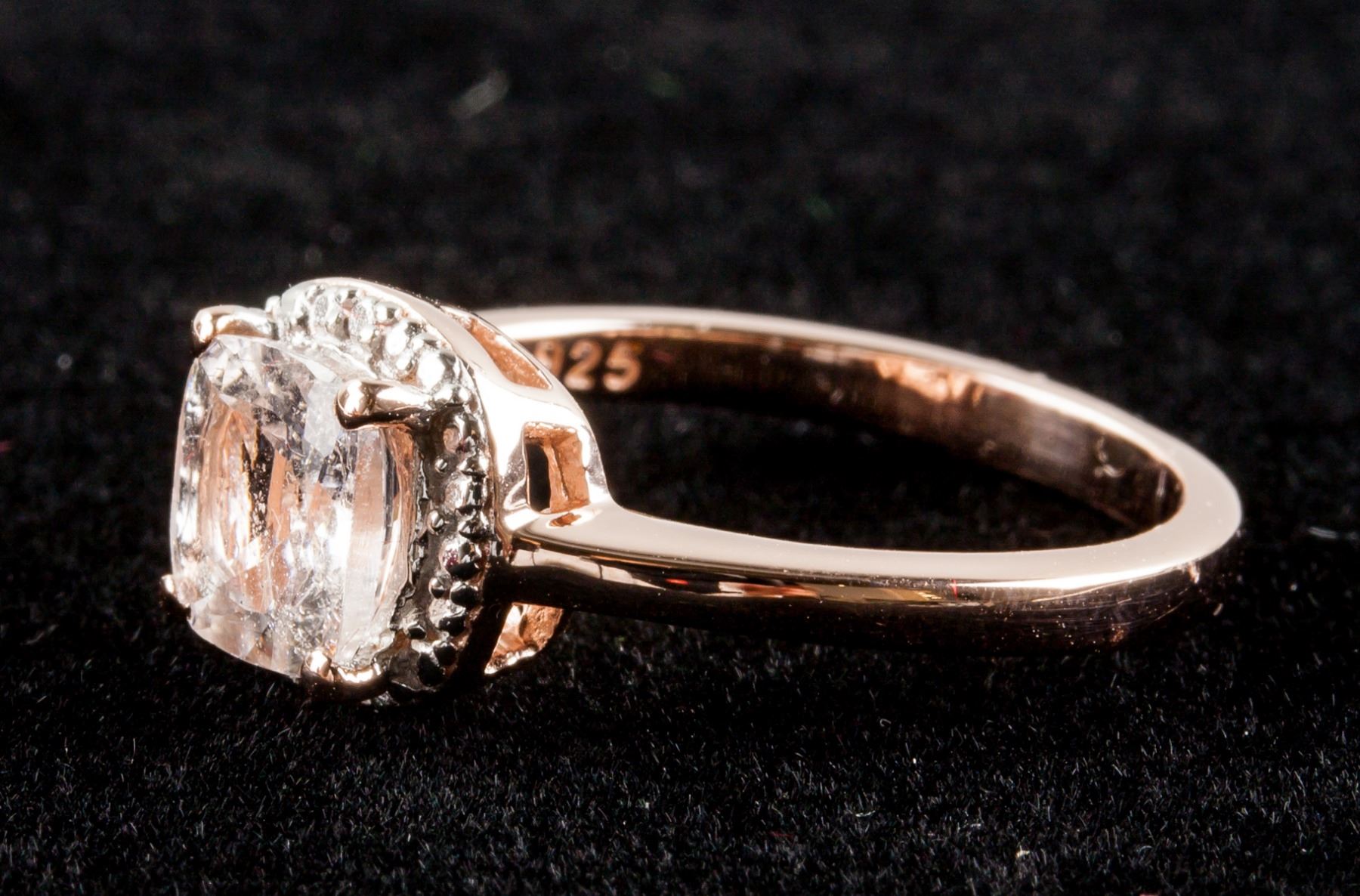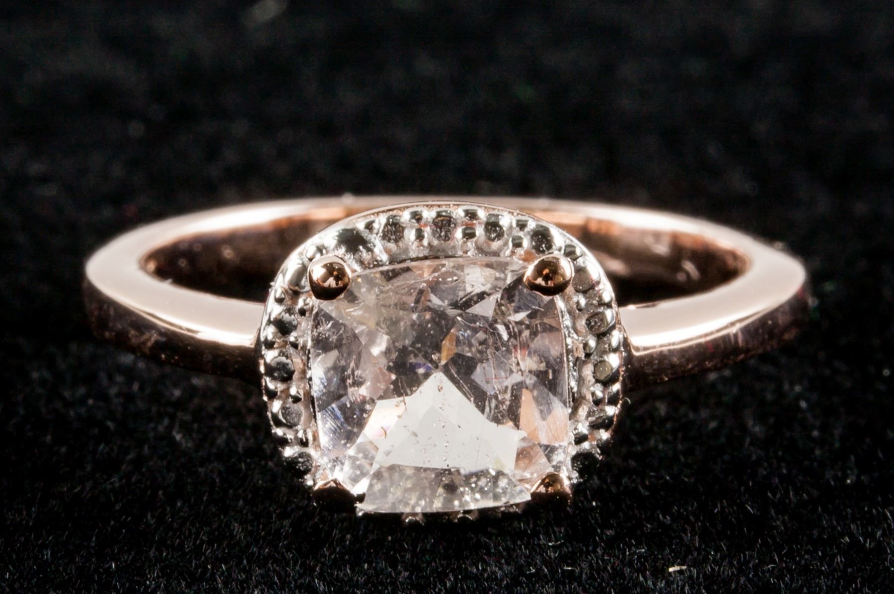 Stamped 925 silver, rose-gold plated ring. Set with square cut morganite. Retail value $300.