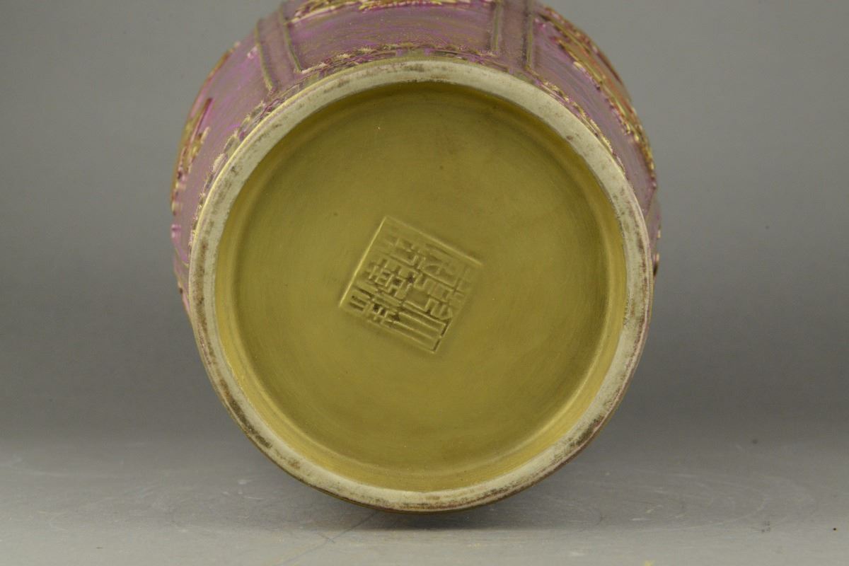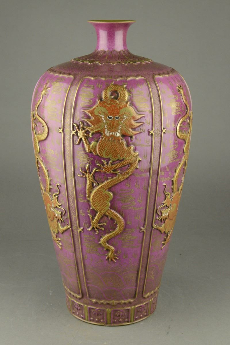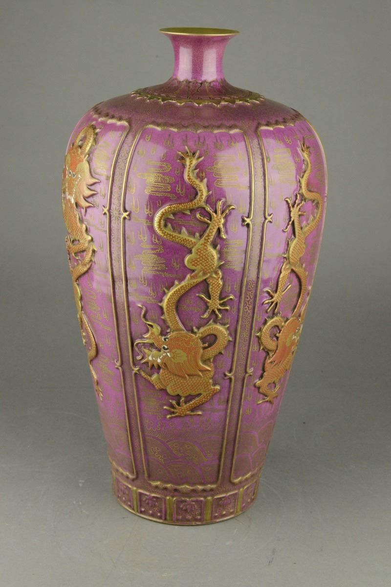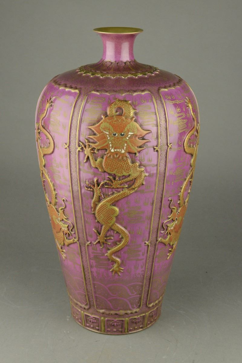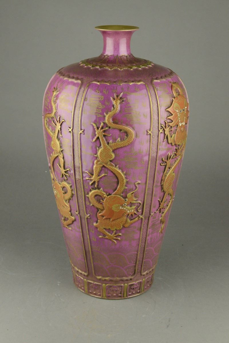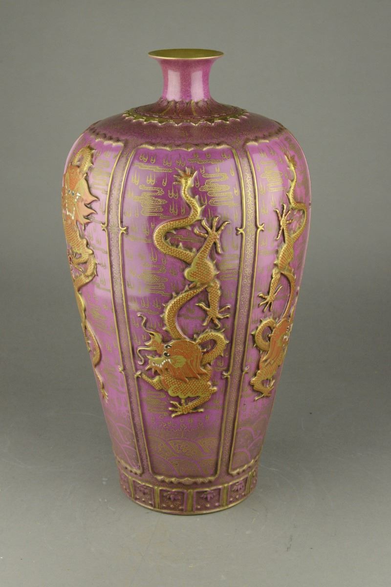 Rose ground Meiping, with five panels painted with five writhing five-claw dragons on metallic sheen ground. Six character Qianlong mark on base. H: 43 cm, D: 23 cm. Provenance: T. Ng Collection Toronto.