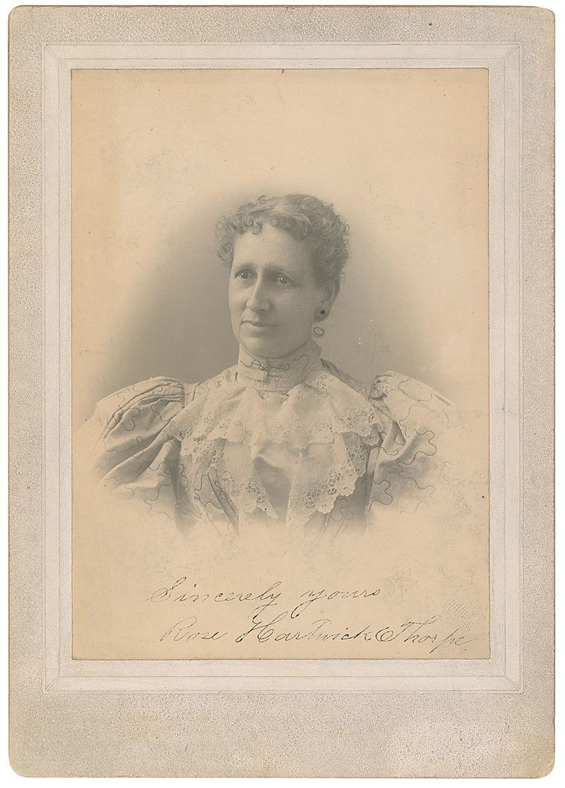 American author (1850–1939) best known for her popular poem ‘Curfew Must Not Ring Tonight.’ Original 5 x 7.5 cabinet photo by Dammand of Pacific Beach, signed at the bottom of the image in black ink, “Sincerely yours, Rose Hartwick Thorpe.” Light scattered soiling and fingerprints to the photo, slightly affecting the signature, and some irregular adhesion to the signature, otherwise fine condition.