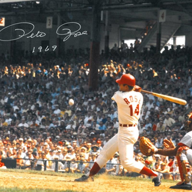 "Rose Hitting in Crosley Field" is an archival photograph featuring Pete Rose taken by photographer Sarge Marsh circa 1969. This photo is autographed boldly by Pete Rose. Measures approx. 20" x 16" (image).
