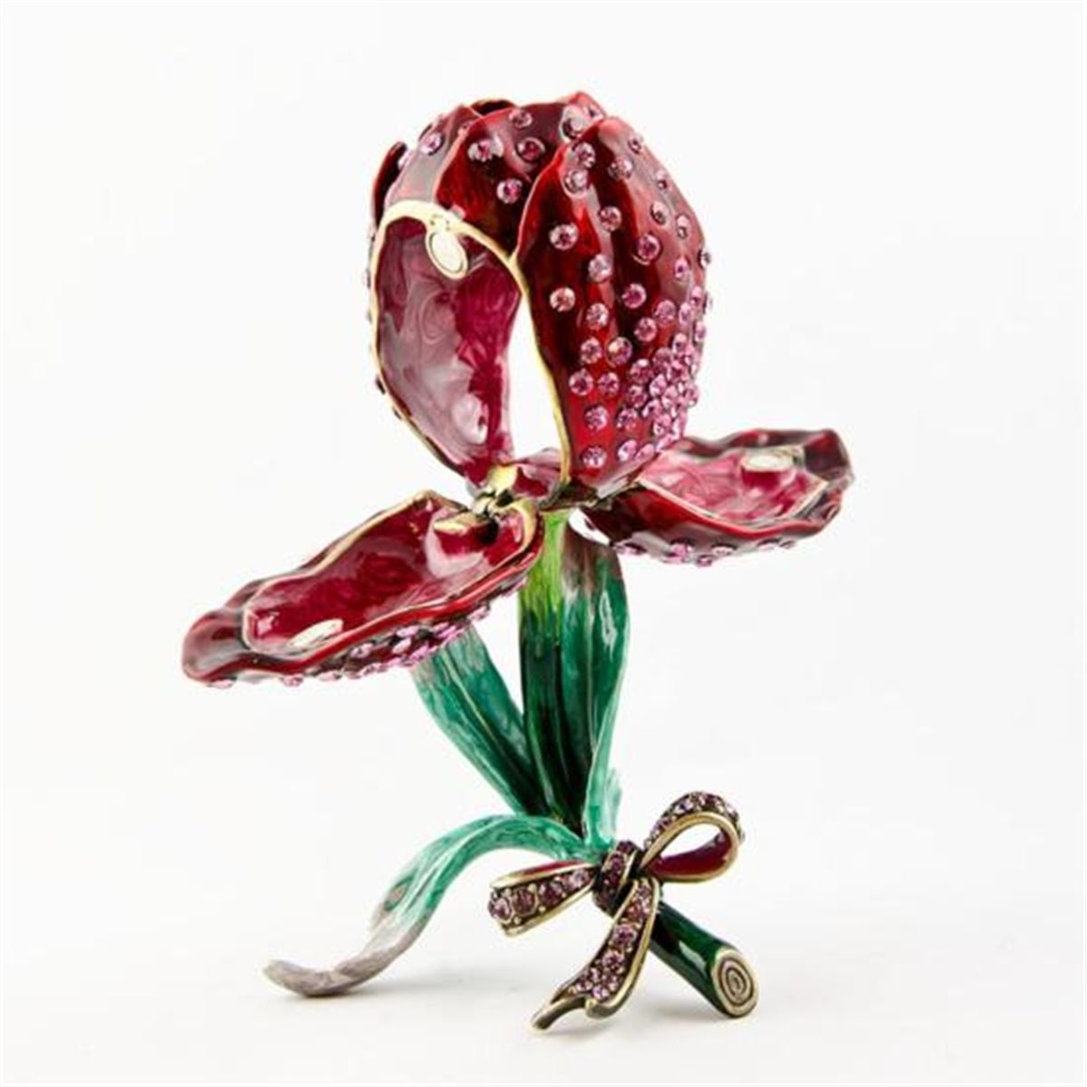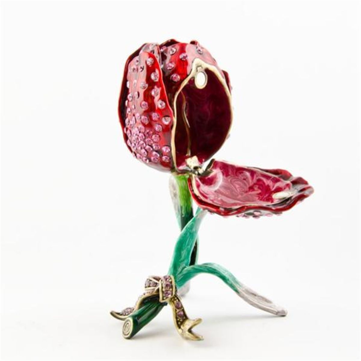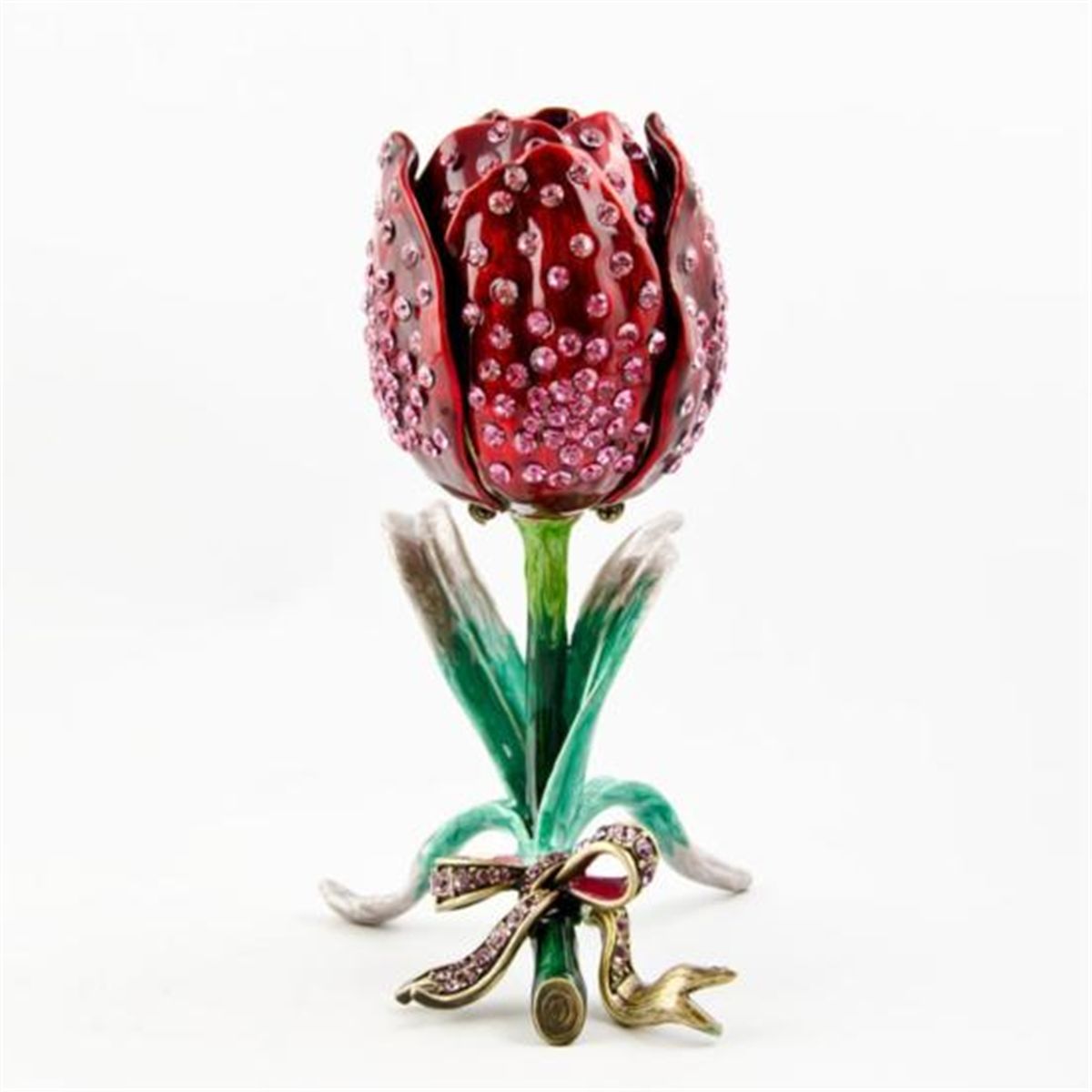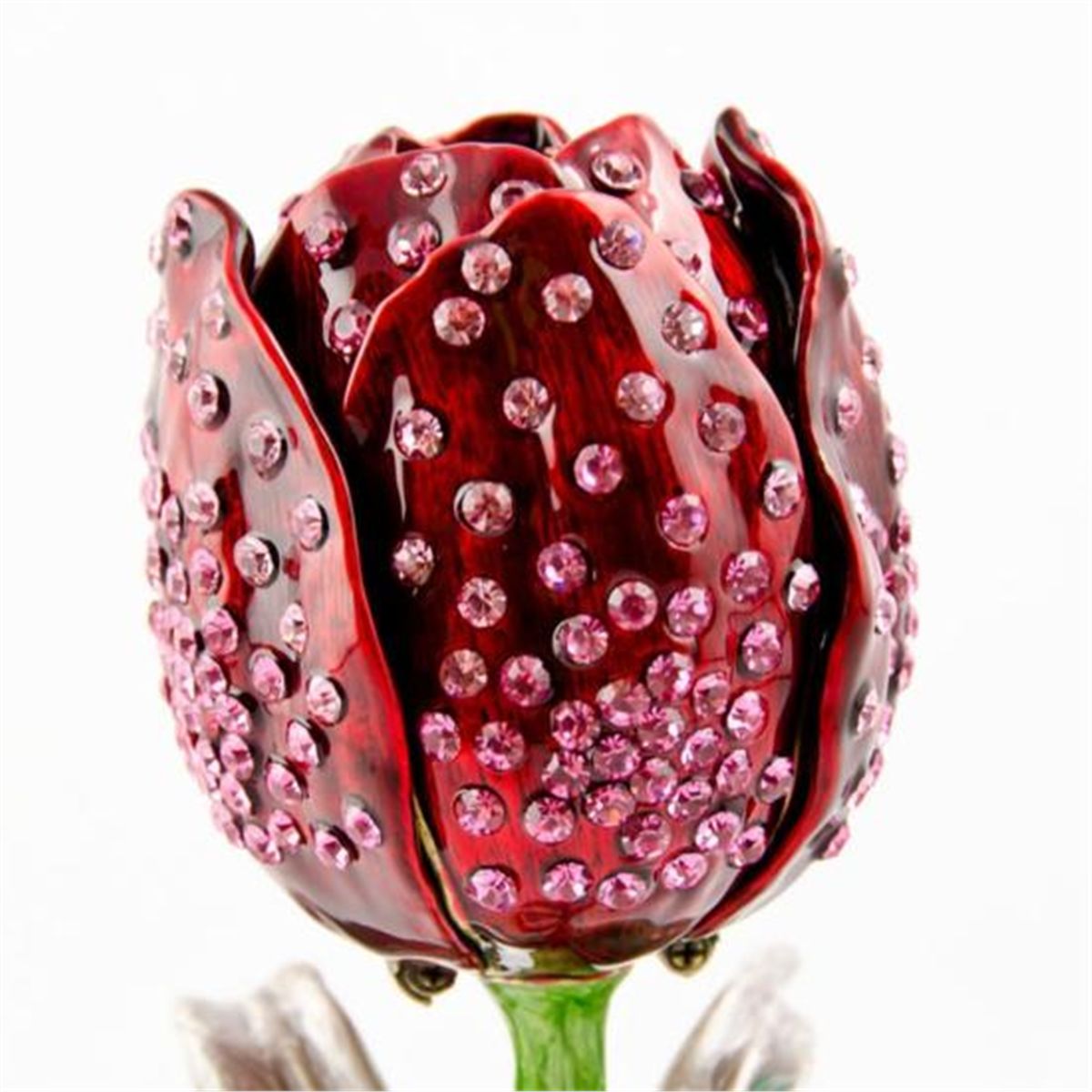 Rose Jewelry Trinket Box, The jewelry box is made by green and red enamel. The rose leaves are covered all over with miniature pink crystals giving it a shiny spark. Two of the leaves open up to provide a jewelry space. Material: Pewter, Austrian Crystals, Enamel. Dimensions: 4in (H) The famed Faberge eggs are jeweled eggs, often with the most ornate, minuscule designs on them. The House of Faberge made the original pieces from 1885 to 1917. At that time, they became popular gifts given during the Easter season. Larger versions were made for the Russian royal family, including Alexander III and Nicolas II. Of these, 42 of the 50 originals exist today. Most Faberge eggs, though, were much smaller and hung from a chain around the neck. These eggs have precious metals on them or gemstone decorations, often with intricate detailing. These are a symbol of luxury and thought of as individual masterpieces.
