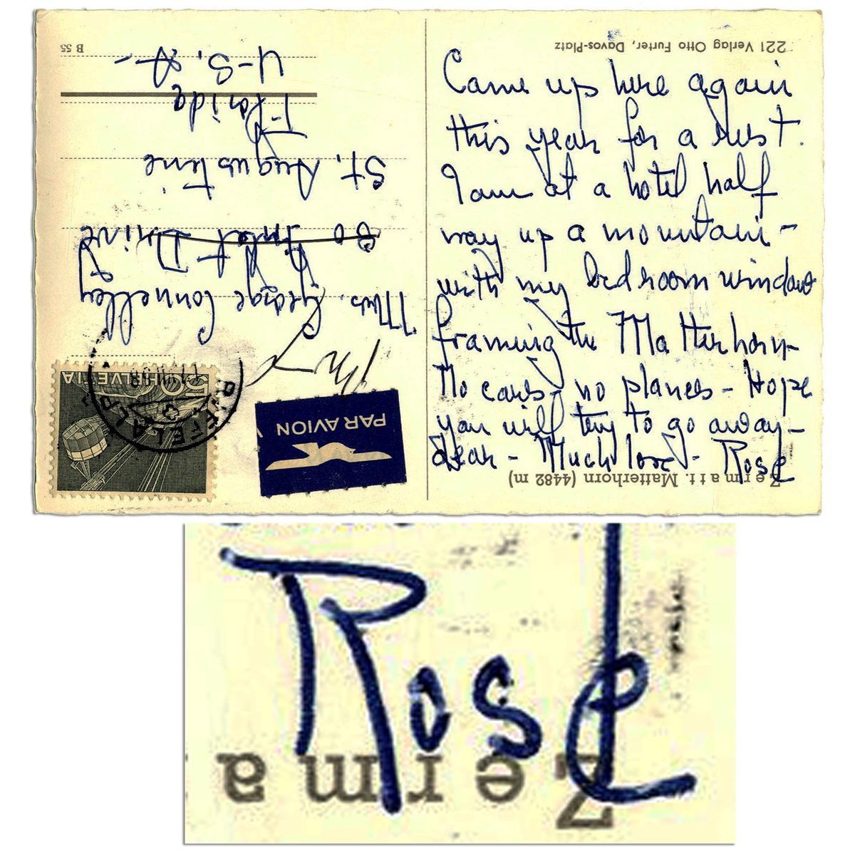 Rose Kennedy pens a postcard from her vacation in Switzerland to her sister-in-law, Loretta Connelly. Pictorial postcard features the Matterhorn and reads in full: ''Came up here again this year for a rest. I am at a hotel half-way up a mountain - with my bedroom window framing the Matterhorn - No cars - no planes - Hope you will try to go away - dear - Much love - Rose''. Her message is written upside down, next to the address. Undated, with postmark partially obscured. Measures 5.5'' x 3.5''. Some creasing and irregularity to the edges, else near fine.