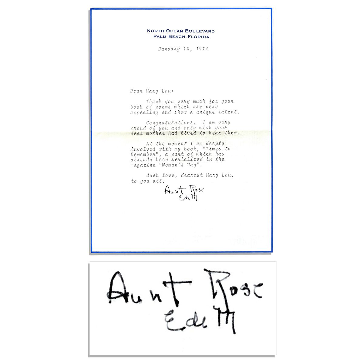 Mother of one President and two Senators, Rose Kennedy typed letter signed dated 18 January 1974. Rose writes to her niece Mary Lou, ''...I am very proud of your and only wish you dear mother had lived to hear them...At the moment I am deeply involved with my book,'Times to Remember', a part of which has already been serialized in the magazine ''Woman's Day''...[signed] Aunt Rose Edith[?]''. Kennedy released her best selling book later that year. Document measures 5.75'' x 7.5'' in near fine condition.