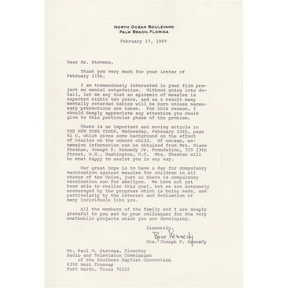 TLS, one page, 7.25 x 10.5, North Ocean Boulevard letterhead, February 17, 1969. Letter to Paul M. Stevens, the director of the Radio and Television Commission of the Southern Baptist Convention, in part: “I am tremendously interested in your film project on mental retardation. Without going into detail, let me say that an epidemic of measles is expected within two years, and as a result many mentally retarded babies will be born unless necessary precautions are taken. For this reason, I should deeply appreciate any attention you could give to this particular phase of the problem…Our great hope is to have a day for compulsory vaccination against measles for children in all states of the Union, just as there is compulsory vaccination now for smallpox. We have not yet been able to realize this goal, but we are extremely encouraged by the progress which is being made, and particularly by the interest and dedication of many individuals like you.” In fine condition.