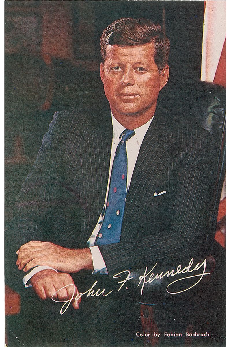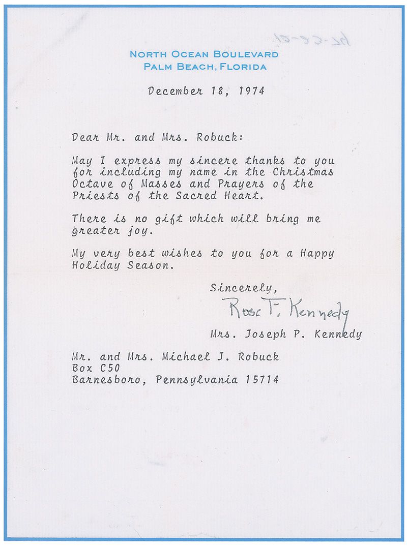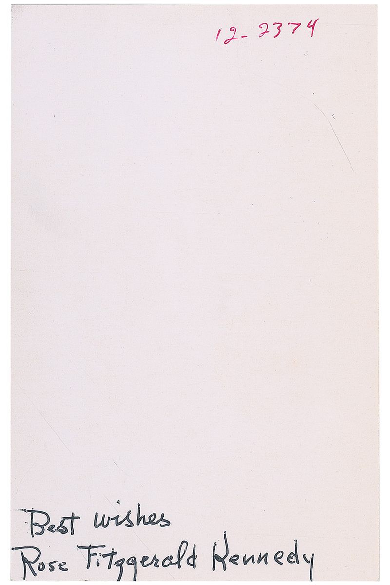 Two items: color 3.5 x 5.5 postcard of JFK, signed on the reverse in black ink, “Best wishes, Rose Fitzgerald Kennedy;” and a TLS signed “Rose F. Kennedy,” one page, 5.75 x 7.75, thanking the Robuck family for including her in their prayers. In fine condition, with a few wrinkles to the letter, scattered impressions to the front of the postcard, and small ink notations to both. Accompanied by original mailing envelopes for both items.