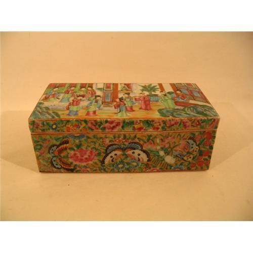 Rose Mandarin decorated razor box with a wonderful array of colors typical of this period of export porcelains. This pariticular piece exemplifies the Rose Famille pattern with 12 figures each with gold highlights to the hair along with the traditional peoni and butterfly pattern on the sides. To the inside of the box, the center divider is edged in a bronze colored trim indicative of the earlier peices (as compared to late 19th and 20th century peices where this edge is more gold in tone) This piece dates to the early 1800's, is in very good shape with a small and very old stress crack to one corner of the box itself. Circa 1800. Measuring 8 1/2 long by 4 1/2 wide by 3 deep