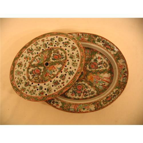 Fabulous Rose Medallion service platter with original strainer. This matching set is a second period Rose Medallion service that dates to circa 1870. The set is in perfect condition with no rim chips to the outer edges of the platter or strainer. There are minor chips on the platter where the strainer rests on the platter itself. They are not visible with the strainer in place.The birds and peoni are correct and the orange in the floor is the appropriate color the the period. Early 20th century platters do not have these colors or detail in the flowers and birds. The weight is also correct for the period. There is no gold in the hair which is indicative of the later period Rose Medallion pieces exported to the United States. The bottom has wonderful oatmeal color and texture. Finding a "true" matching set is a real challenge. This peice measures 16 1/2" long by 13 3/4" wide so it is of substantial size and weight. The service area measures 12" by 9 1/2".