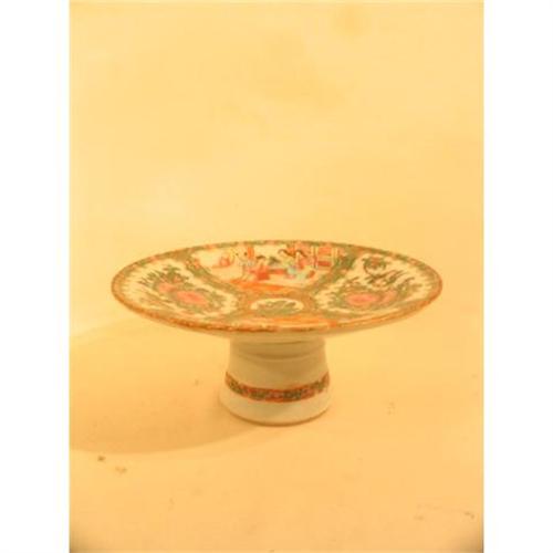 Nice rare form period Rose Medallion Tazza - today referred to as a cake plate. Nicely defined madallion (peony and bird) surrounded by panels having 5 figures with a green cartouche. Gold on the rim and traces of gold in the hair. Nice color.  No rim chips or restoration. Measures 10 1/4 across and 4 1/2 high.  Circa 1830