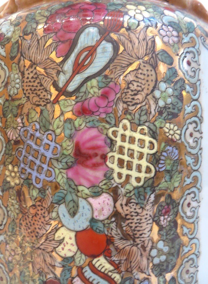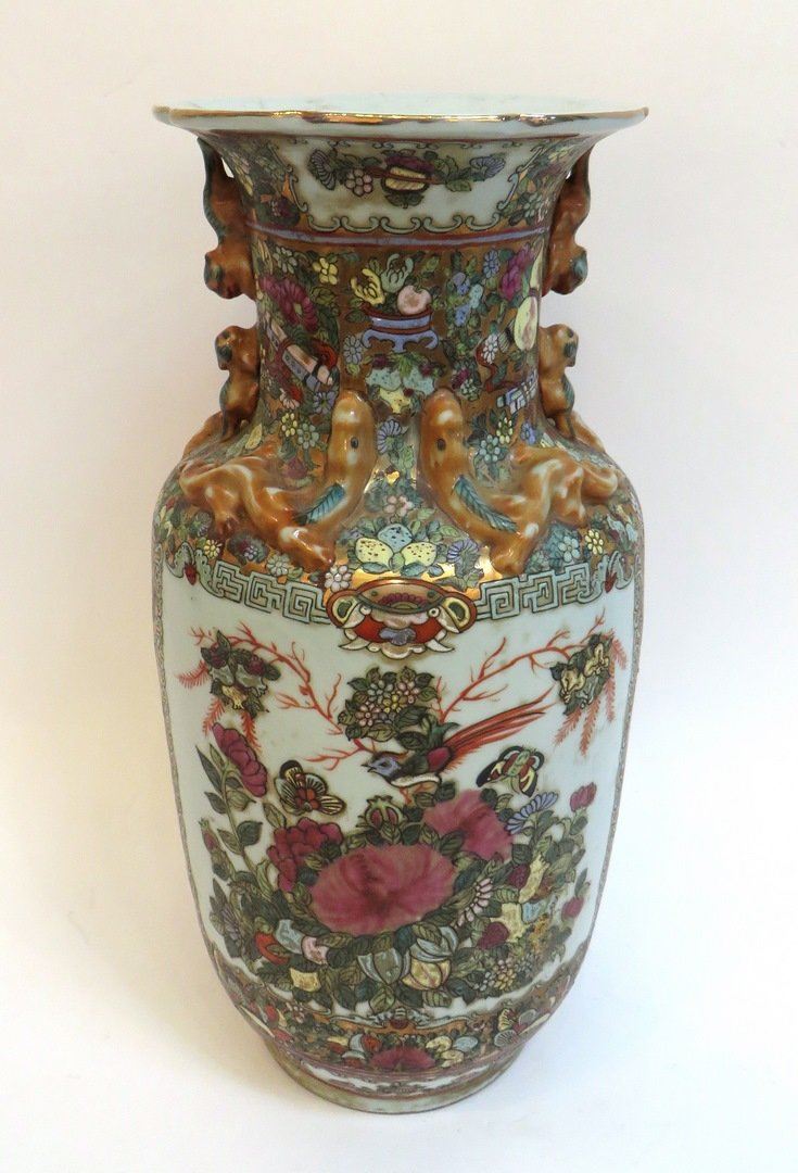 The vase with foo dog handles and lizards at the base of the neck. The base is decorated with flowers, birds, and butterflies on one side. The other side is a scene of an emperor with ladies of the court and supplicants. There is a meander border around the seems. Bottom has been drilled out. Marked on the bottom 'Made in Hong Kong'. Mark on the bottom.