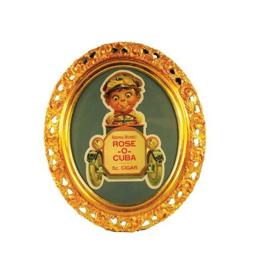 Rose-O-Cuba die cut cardboard sign. A great Automotive Image. In gold leaf gesso frame, mint condition. 11 X 16 1/2 inches.