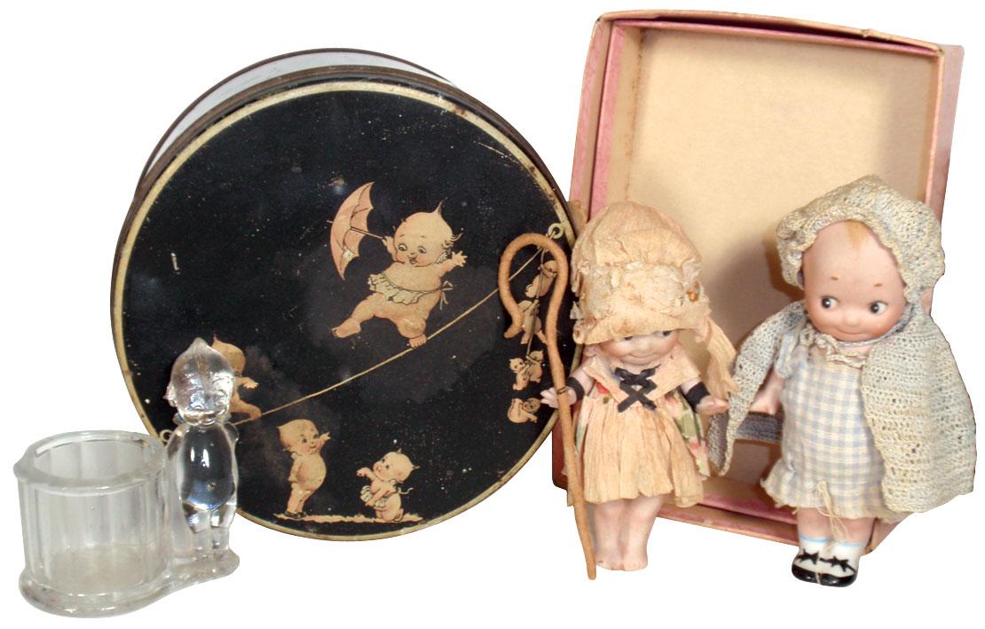 Rose O'Neill bisque dolls (2), Kewpie candy container by Geo. Borgfeldt-NY & tin w/Kewpies on tight