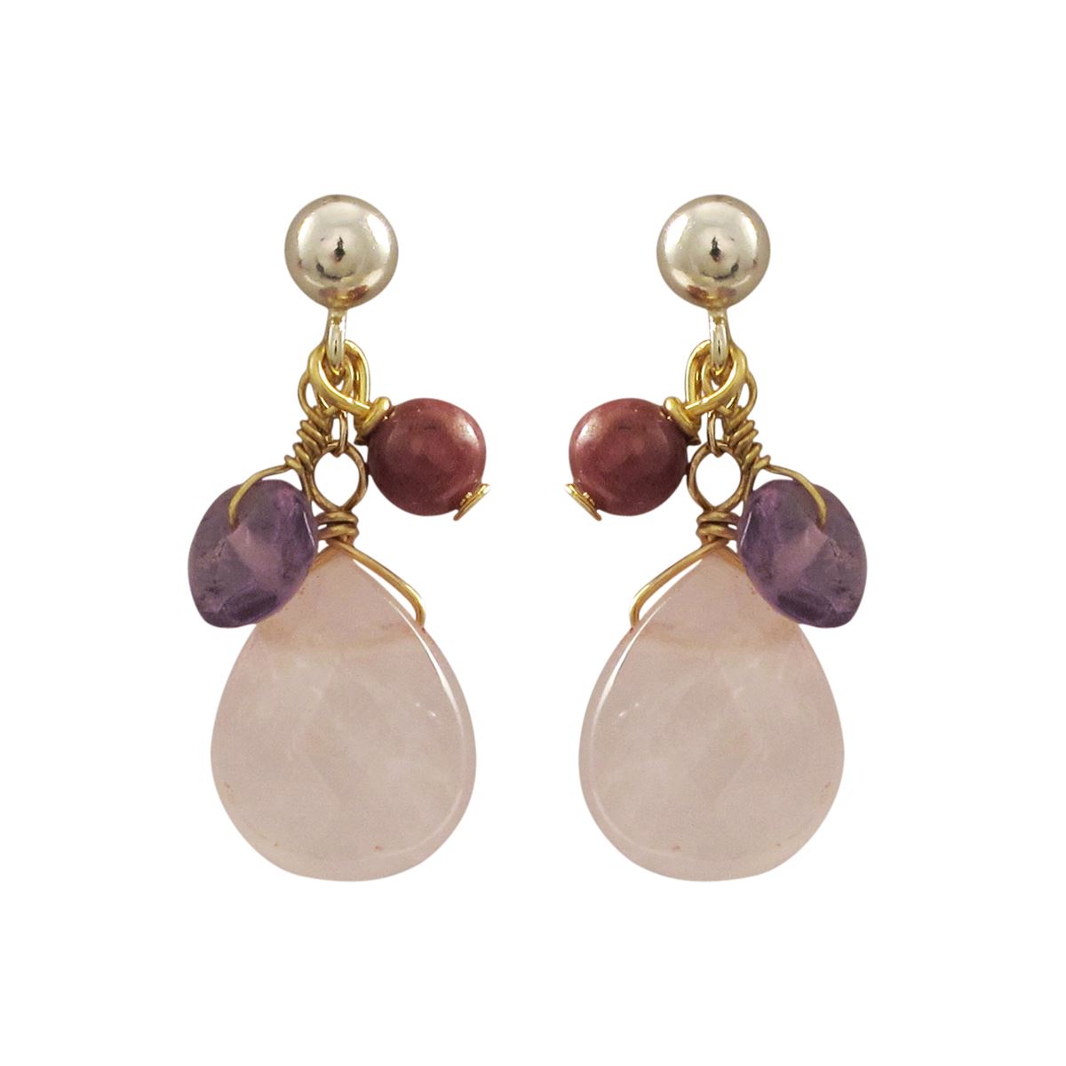 Rose Quartz Combination Semi Precious Stones On Gold Plated Sterling Silver Post Earrings-0.87"