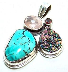 Silver and Rose Quartz, Garnet, Titanium Drusy & Turquoise Pendant. Allow 6 to 8 weeks for delivery.