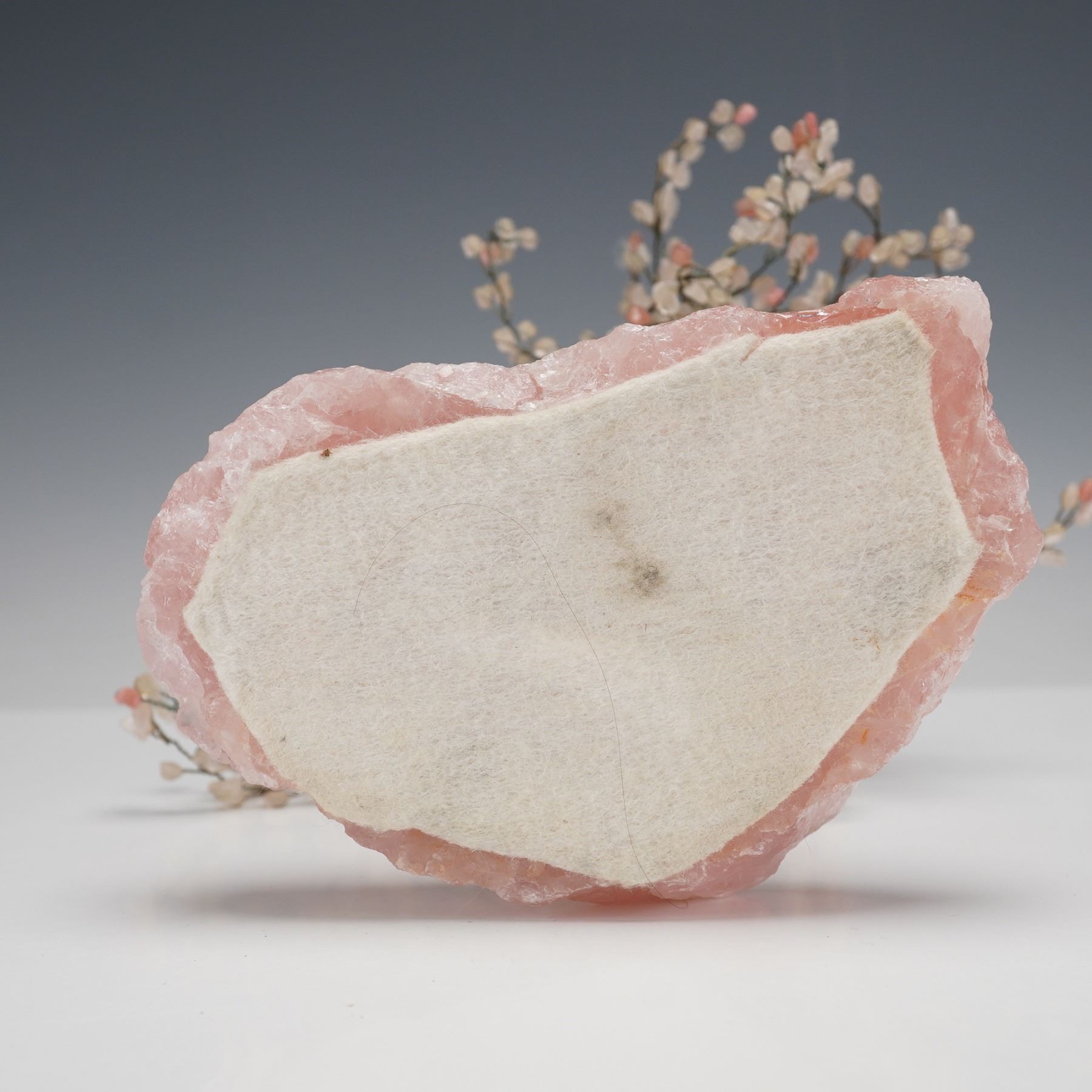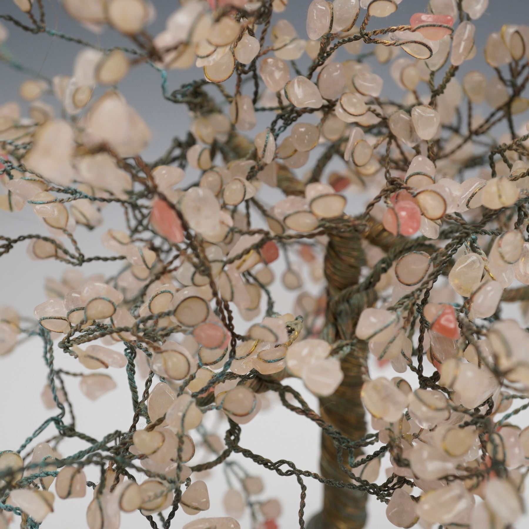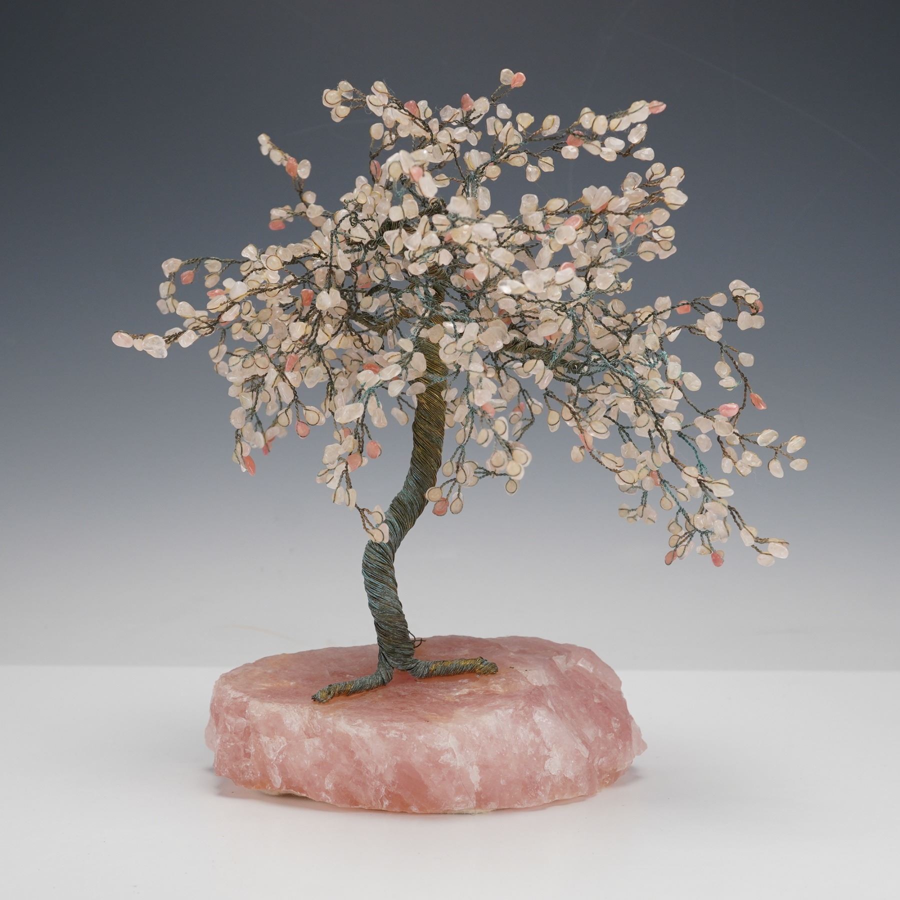 A handcrafted gemstone wire sculpture depicting a delicate willow tree with branches made of twisted metal wire adorned with small polished rose quartz and pink-toned gemstone leaves. The intricate tree sits atop a solid rough-cut rose quartz base, offering a harmonious blend of natural stone and artistic metalwork. The piece showcases fine craftsmanship with individually shaped branches and stones that evoke the soft hues of spring blossoms, making it a striking decorative accent and a symbol of balance and serenity.
