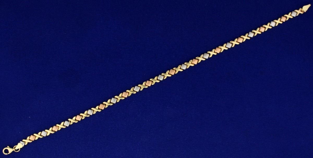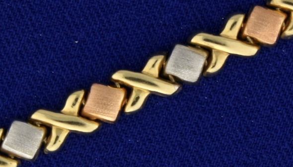 In 14k rose, white, and yellow gold. 10 inches long with safety clasp. 6.5g.