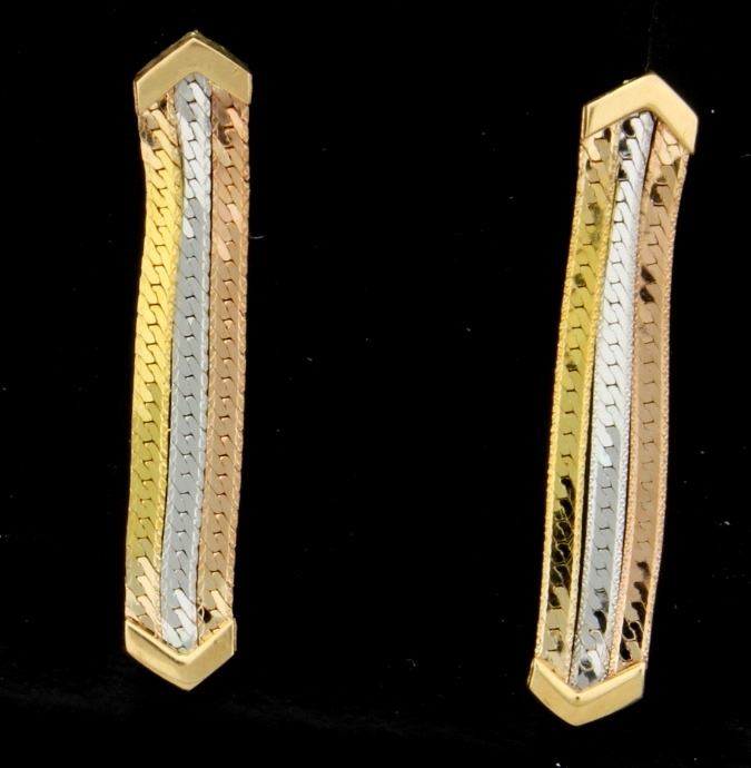 In 14k rose, white and yellow gold these earrings are 1 1/4 inches long and have friction backs. 1.7g